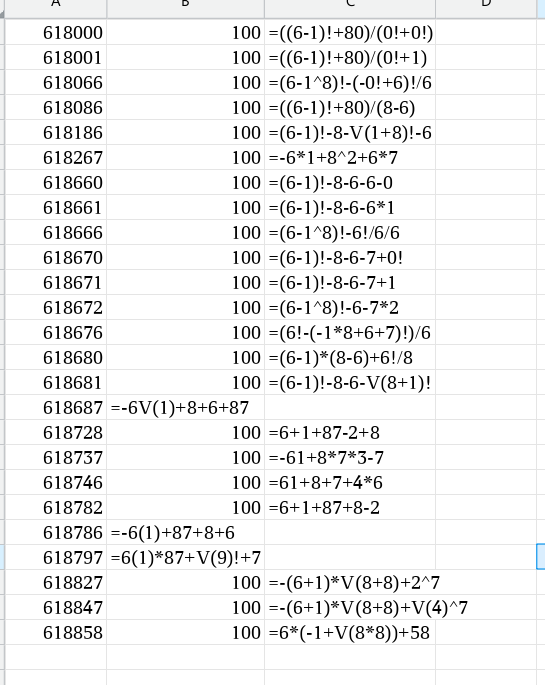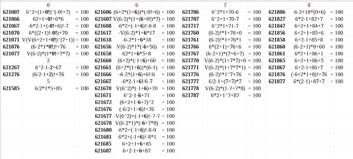 Отлично! Я свой пост там уже не могу отредактировать, получается надо постараться запомнить. Для 620: 6!-20 = 700 (6-2)!+0! = 25 Не 004-007. = 15 вариантов. 620000 620101 620858 620001 620110 620267 620010 620111 620276 620011 620827 620525 620100 620847 620585 Пока с ходу не получилось подобрать 3 варианта. Вроде бы всё нашлось. 620000 100 =(6*2-0!-0!)^(0!+0!) 620001 100 =(6*2-0!-0!)^(0!+1) 620010 100 =(6+2+0!+0!)*10 620011 100 =(6*2-0!-0!)^(1+1) 620100 100 =6*2*0+100 620101 100 =-V(6-2)+0!+101 620110 100 =(6+2+0!+1)*10 620111 100 =-6*2+0!+111 620827 100 =-6*2*0!+8*2*7 620847 100 =-6*2*0!+8*V(4)*7 620858 100 =6+2-0!+85+8 620267 100 =(6!-V(V(20^(-2+6))))/7 620276 100 =(6!-(2*0-2+7)!)/6 620525 100 =(6-2+0!+5)*2*5 620585 100 =6^2+0!+58+5