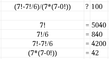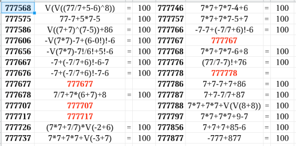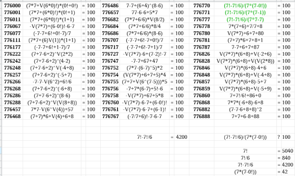 Итого, все "семёрки" разобраны! По дороге было немало нетривиальных решений: 711167 => 71+1+V(16)*7 = 100 767177 => (-7+6!-7+1-7)/7 = 100 767707 => (-7+6!-7-7+0!)/7 = 100 771767 => (-7-7+1-7+6!)/7 = 100 776770 => (7!-7!/6) / (7*(7-0!)) = 100 776771 => (7!-7!/6) / (7*(7-1)) = 100 776777 => (7!-7!/6) / (7*7-7)) = 100 Не решены: решены!.. но пока не все. 777707 777717 777767 777778 Дальше - "шестёрки".
