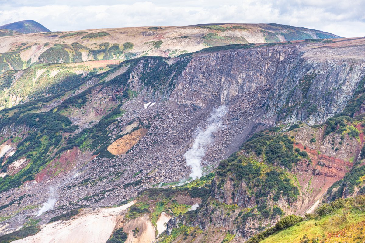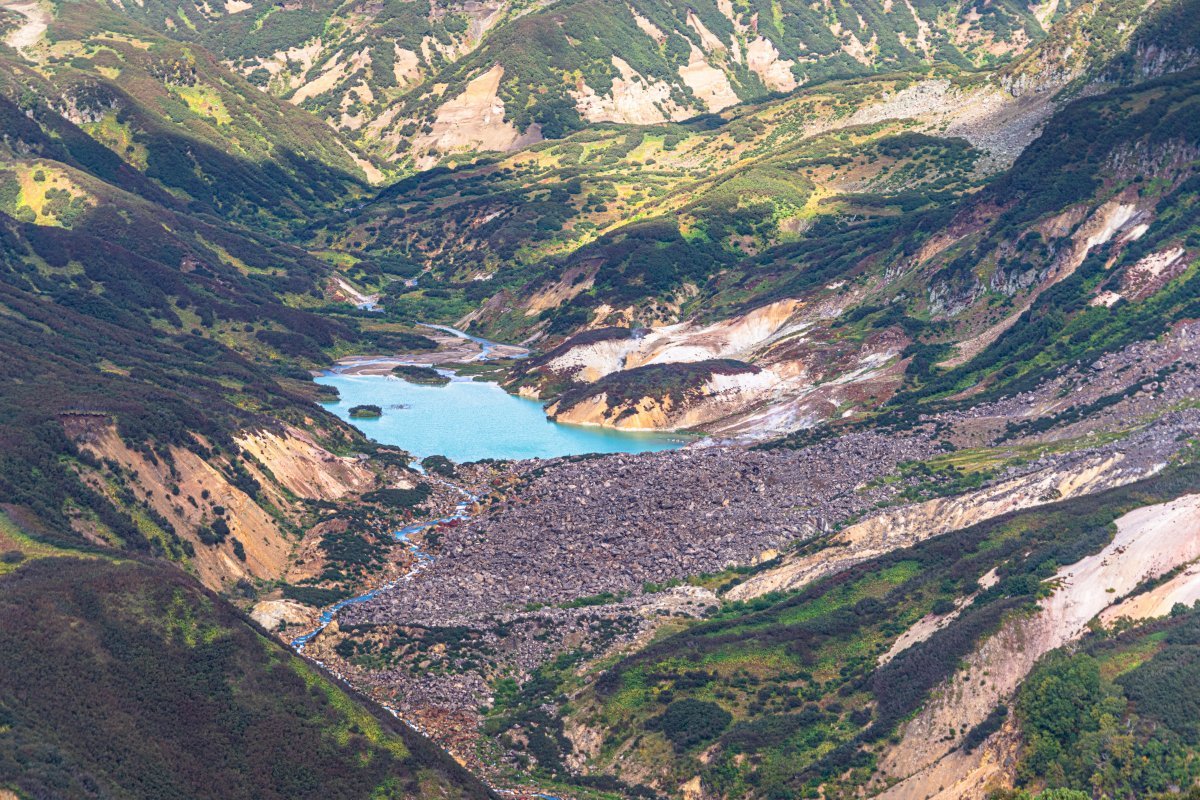 Красотища, однако! Ну, сами посмотрите - А вот это симпатичное озеро - результат ещё одного оползня, который перегородил речку, запрудил её - и в результате по причине неведомых подземных корреляций перестал работать гейзер Великан в Долине гейзеров, который находится, пардон, на 2.5 км юго-западней от оползня и озера. Вот такие природные связи у вроде бы разных геополитических географических событий. И, кстати, там тоже что-то шипит, бурлит и паром пышет. Но мы туда сегодня в этот раз не пойдём.. А идём мы сейчас в Долину смерти. Шутки по дороге были самые очевидные, они приелись настолько, что даже не запомнились. Всё это чудесачие (Долины Гейзеров и Смерти, а также кальдера Узон) - всё это результат работы вот такого симпатичного вулкана с не менее изощрённым названием Кихпиныч. Да-да, вулкан Кихпиныч - прошу любить и жаловать. Ага, а мы вот и почти пришли - Долина смерти.