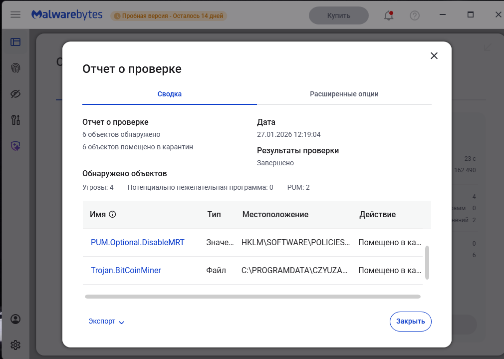 7. Здравствуйте. Где-то умудрилась подхватить этот вирус. Заметила нагрузку системы в покое. Просканировала Malwarebytes. Нашёл, поместил в карантин. Из карантина удалила, но через пару секунд снова падают в карантин 2 файла с трояном. И так до бесконечности.