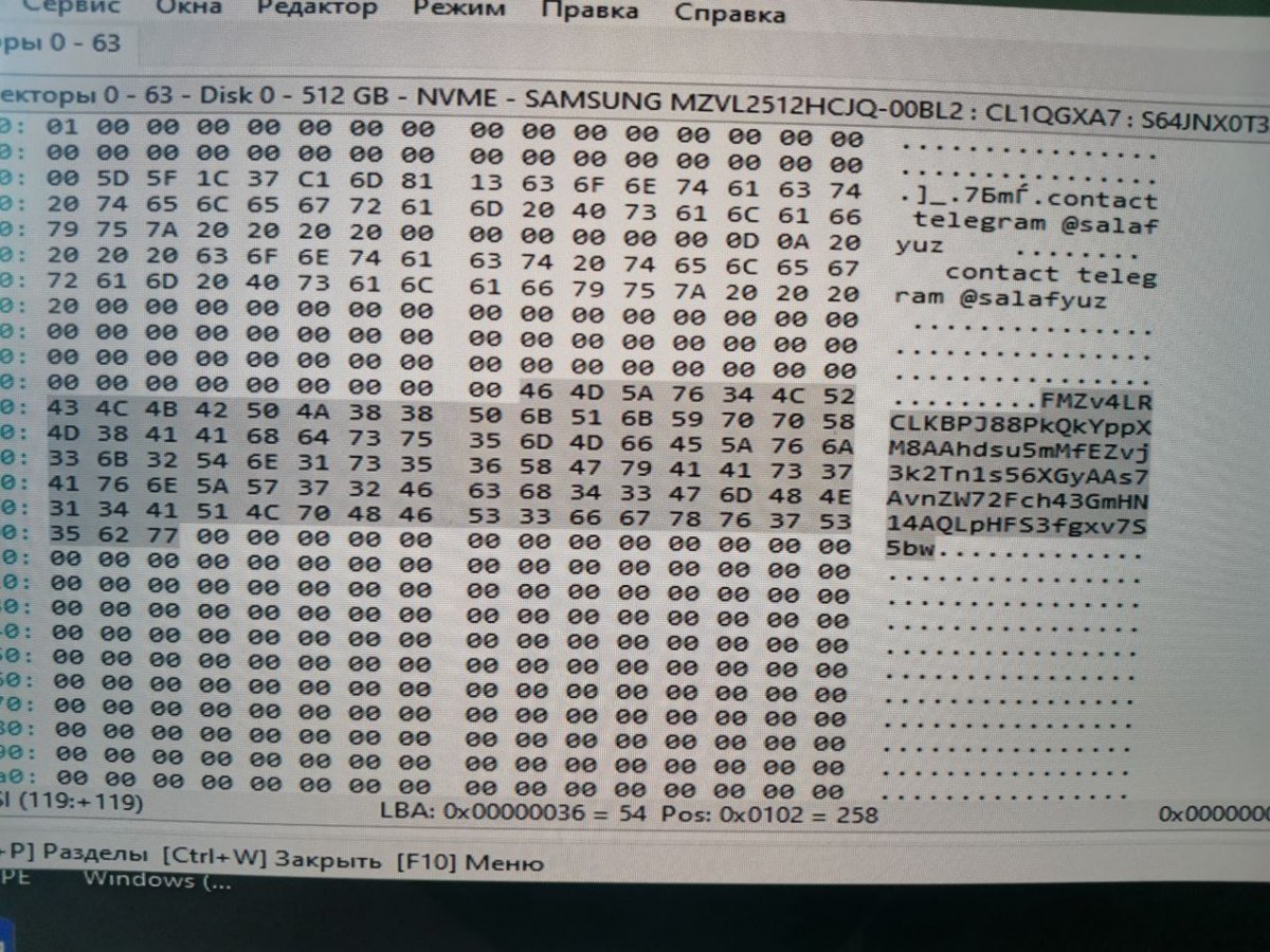 Уже что то засветилось, но возможно что опять есть ошибки считывания с последнего скрина. Choose one of the supported variants: r - Red Petya g - Green Petya or Mischa d - Goldeneye [*] My petya is: Victim file: id.txt [+] Victim ID: FMZv4LRCLKBPJ88PkQkYppXM8AAhdsu5mMfEZvj3k2Tn1s56XGyAAs7AvnZW72Fch43GmHN14AQLpHFS3fgxv7S5bw --- [+] Your key : -Ж'@AJфжvЕУFV) т.е. нужен сам бинарный файл. Чтобы можно было извлечь идентификатор без ошибок. (если только в нем самом нет ошибок) Можете загрузить просто бинарный файл с первыми 64 сектора диска (0-63)? В архиве, без пароля. Малой кровью не получится, кровь (от потерянных данных) просто хлынет через монитор, когда начнете форматировать диск. Такая вот грустная шутка. И хорошо бы вам восстановить ссылку, откуда вы скачали данный "сюрприз".
