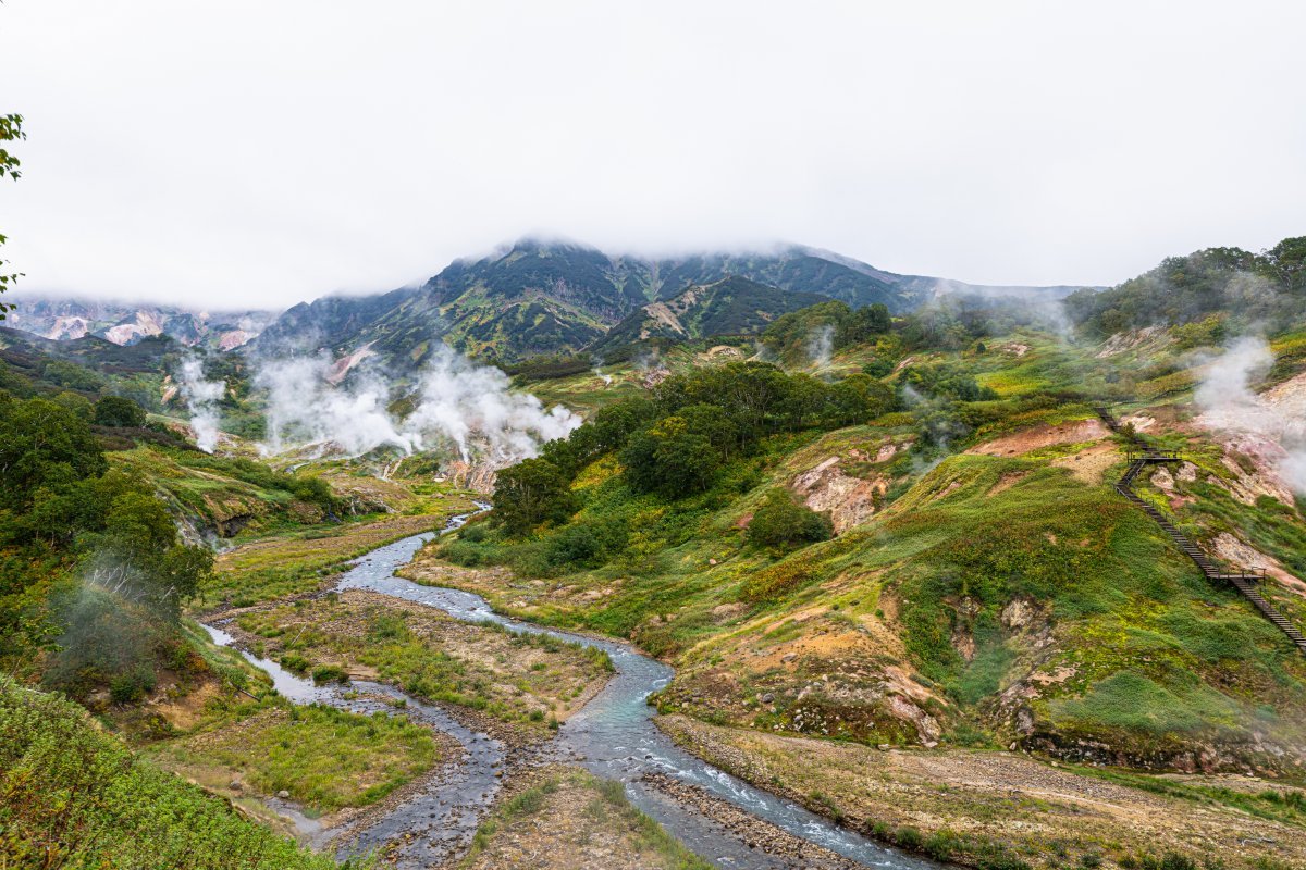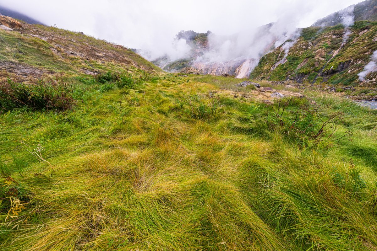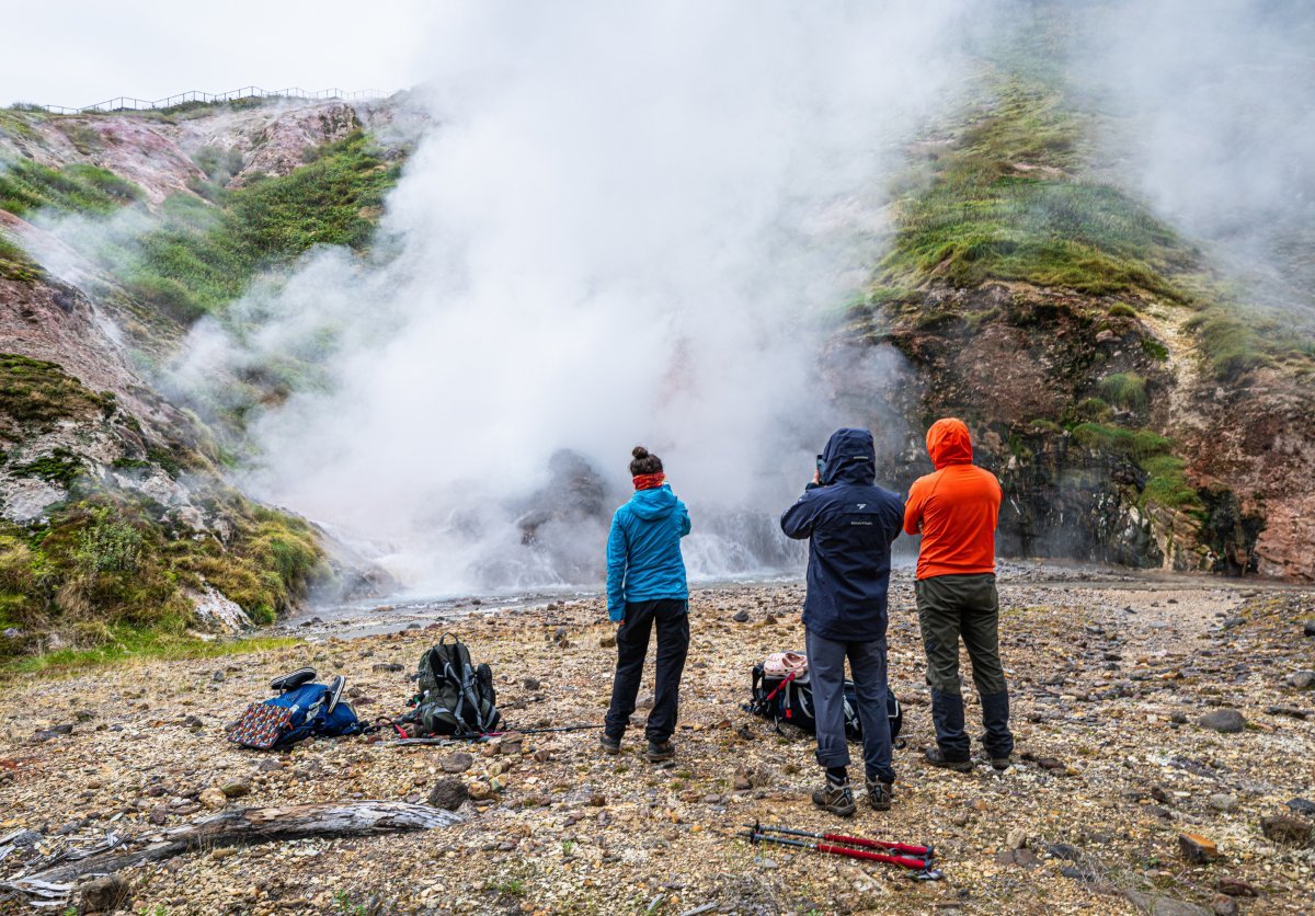 3. Много совершенно волшебных, не побоюсь этого слова - сказочных! - мест на Камчатке. Ключевская группа вулканов, Толбачик и всё что рядом, на юге - Ксудач, Курильское озеро, вулканы Камбальный и Кошелевский. Кальдера Узон (где только что гуляли) и Долина Гейзеров - особая категория вулканических красот. И, само собой, как и в прошлый раз (2024) после полуторачасовой прогулки по Узону нам очень захотелось пешочком пройтись до той самой знаменитой Долины Гейзеров. К тому же, идти не так далеко... "Всего десять километров!" - браво сообщил нам наш гид Денис с многолетним опытом. Но мы-то знаем, что расстояния он всегда меряет по прямой. И действительно, по прямой от Узона до Долины Гейзеров ровно 10 км. Но идти-то надо по условиям ландшафта, так что вся прогулка получается примерно километров около 15. Но оно того стоит! Да и тропа есть - вон там она снизу посередине проглядывает: Ну, пошли! И на вот такие роскошные виды посматриваем направо и налево: И даже солнышка немного дали! Кордон "Глухой" - примерно треть пути освоили. Но самую простую треть... Дальше до перевала, где по пути спугнули мишку - увы, он фотографироваться отказался и довольно резво свинтил в кусты.. А вот и перевал: Небольшой отдых - и дальше самая сложная треть пути. Спуск вниз... Иногда ползти вверх гораздо проще, чем корячиться по дороге вниз. И на тропе в Долину Гейзеров - это тот самый случай.. (вроде бы уже рассказывал в прошлый раз).