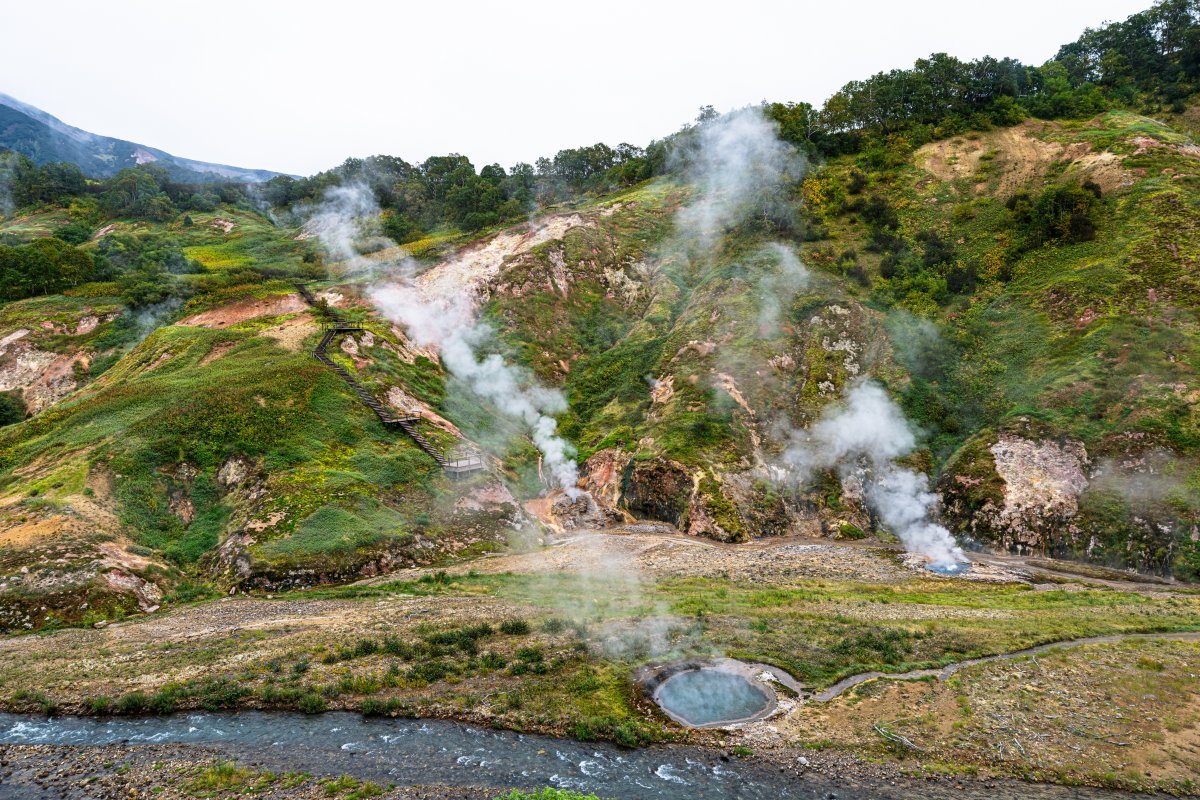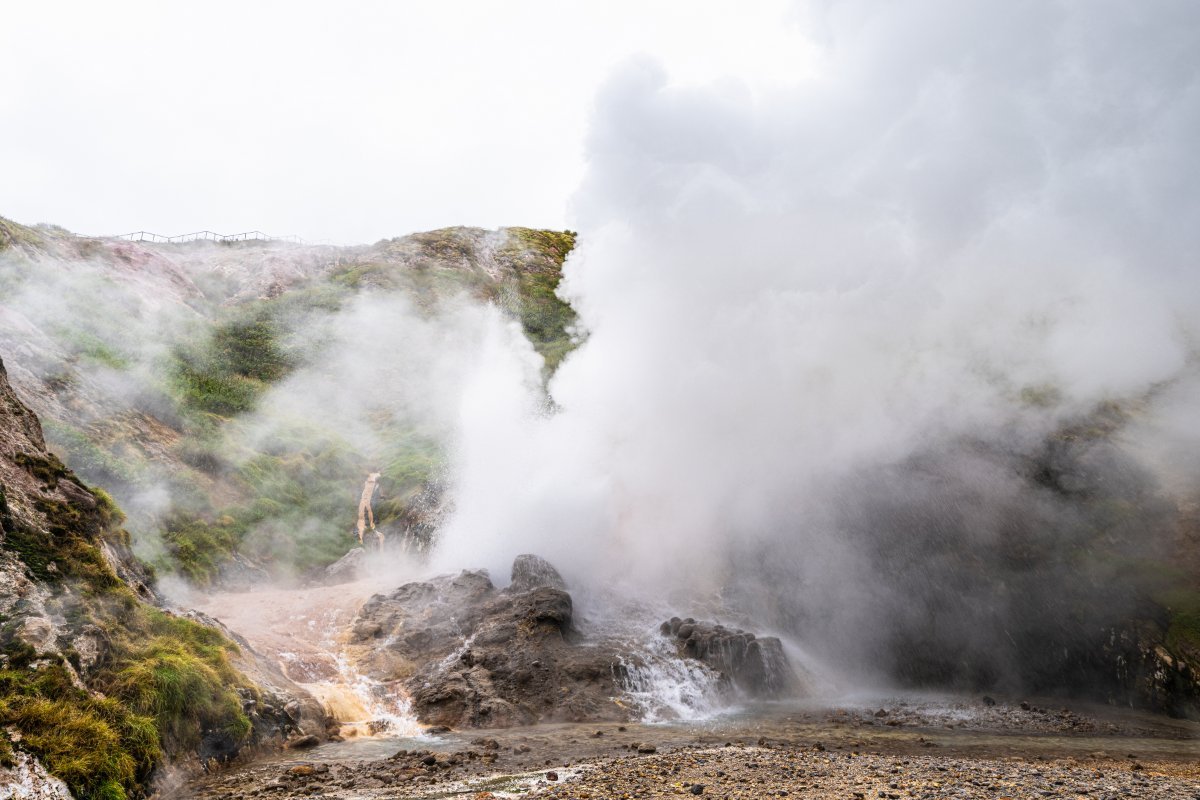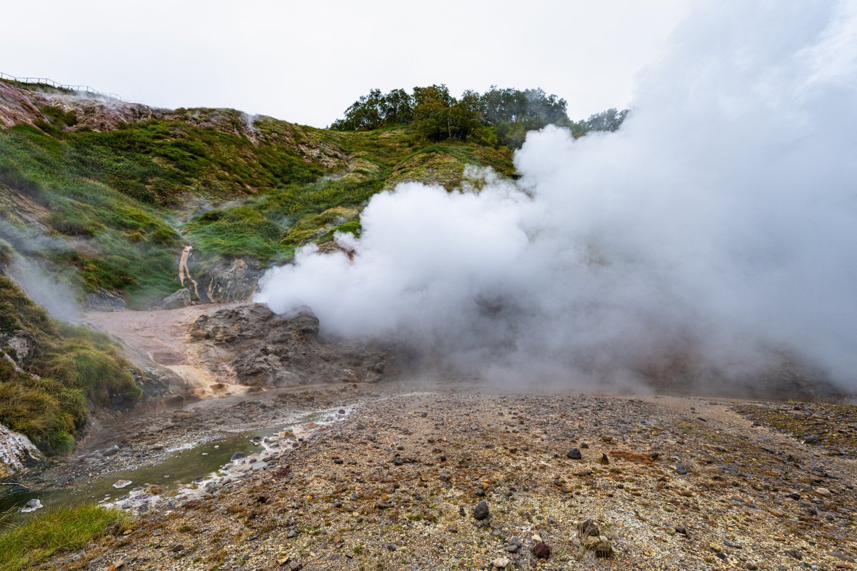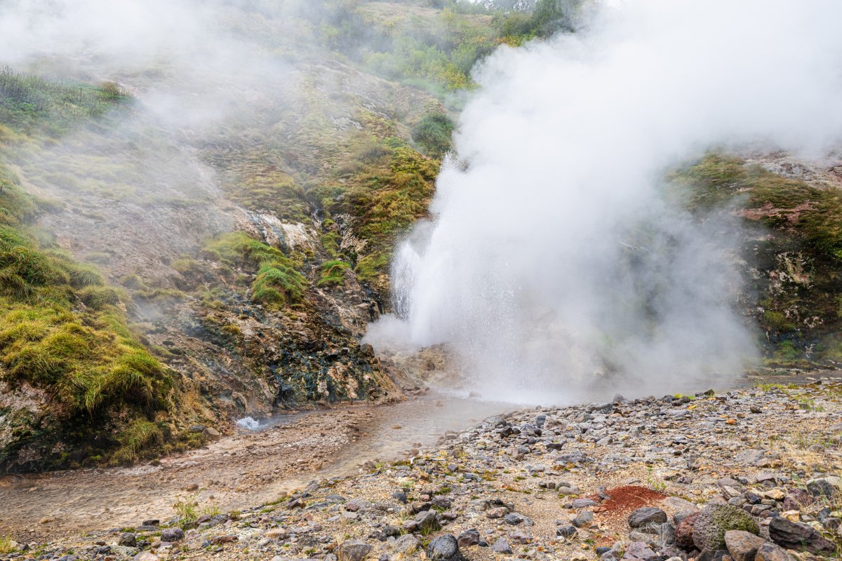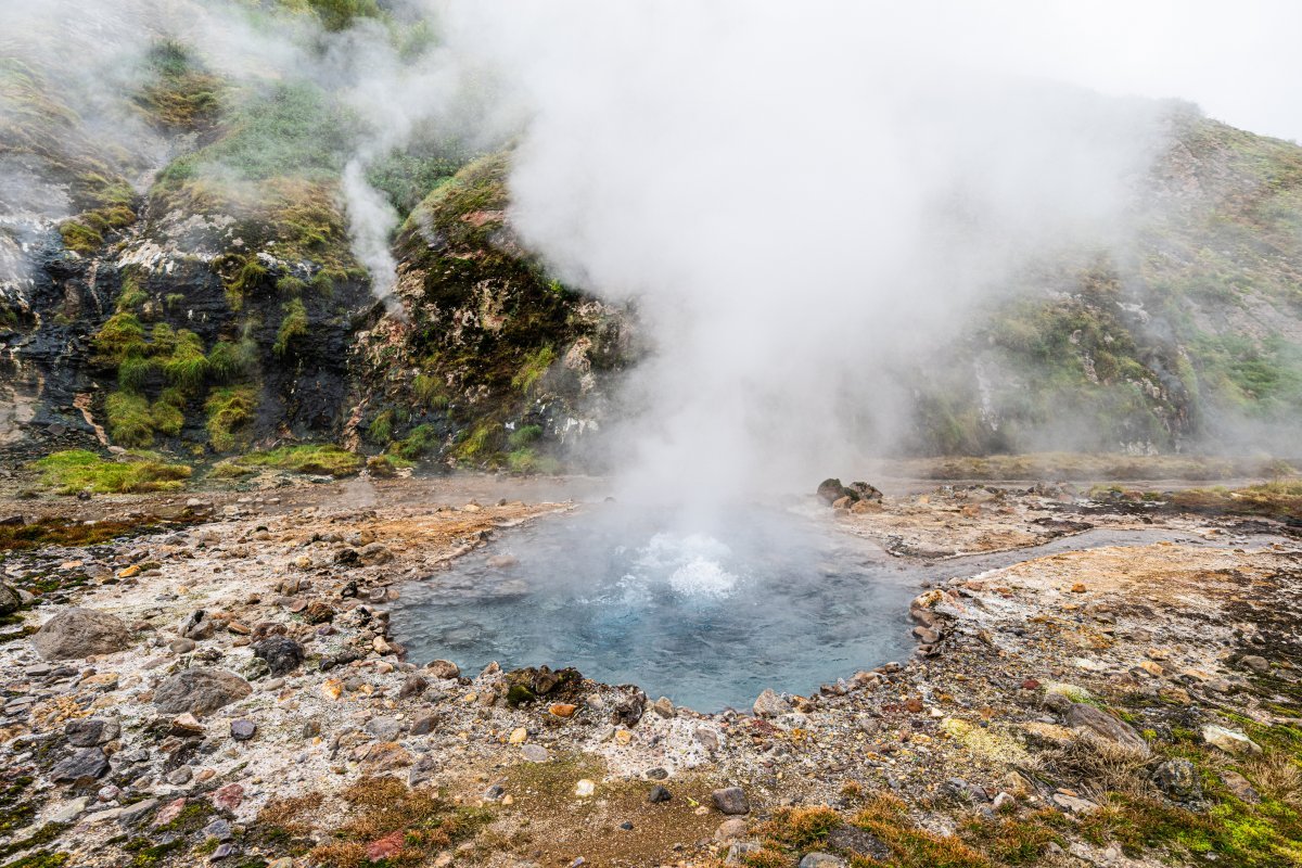8. А теперь время просто погулять по роскошной кальдере Узон, да в вот в таких фантастически осенних красках: Здесь везде проложены комфортные дорожки, и гулять строго по ним - ни шагу в сторону. Да и не хочется... особенно глядя на булькающие и дымящиеся вокруг дорожки пространства. Уже докладывал, но повторюсь, что вот такой ярко-красный цвет в сентябрьскую палитру красок дают: Кусты голубики. Дёрен шведский, ягоды и листья. Арктоус альпийский (толокнянка альпийская) - у него чёрная крупная ягода, а листья краснеют. Вокруг всё традиционно шипит, дымится и пованивает разными вулканическими химиями: Вулканолаги приехали на рыбалку на работу - брать химические пробы местных вулканизмов: Ну и так далее - Извержения единственного здесь гейзера мы так не стали ждать... Поскольку видели его работу в прошлом году: