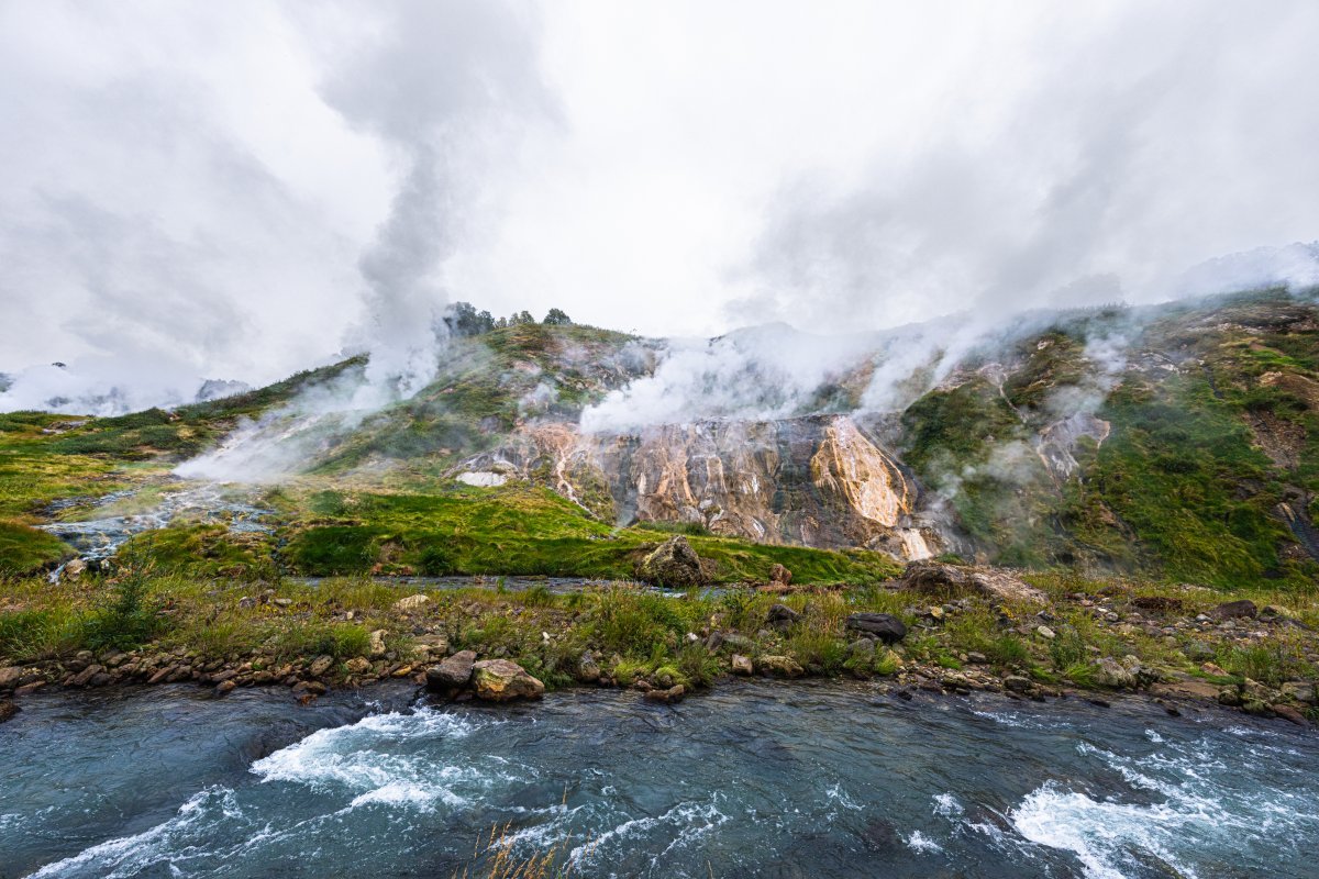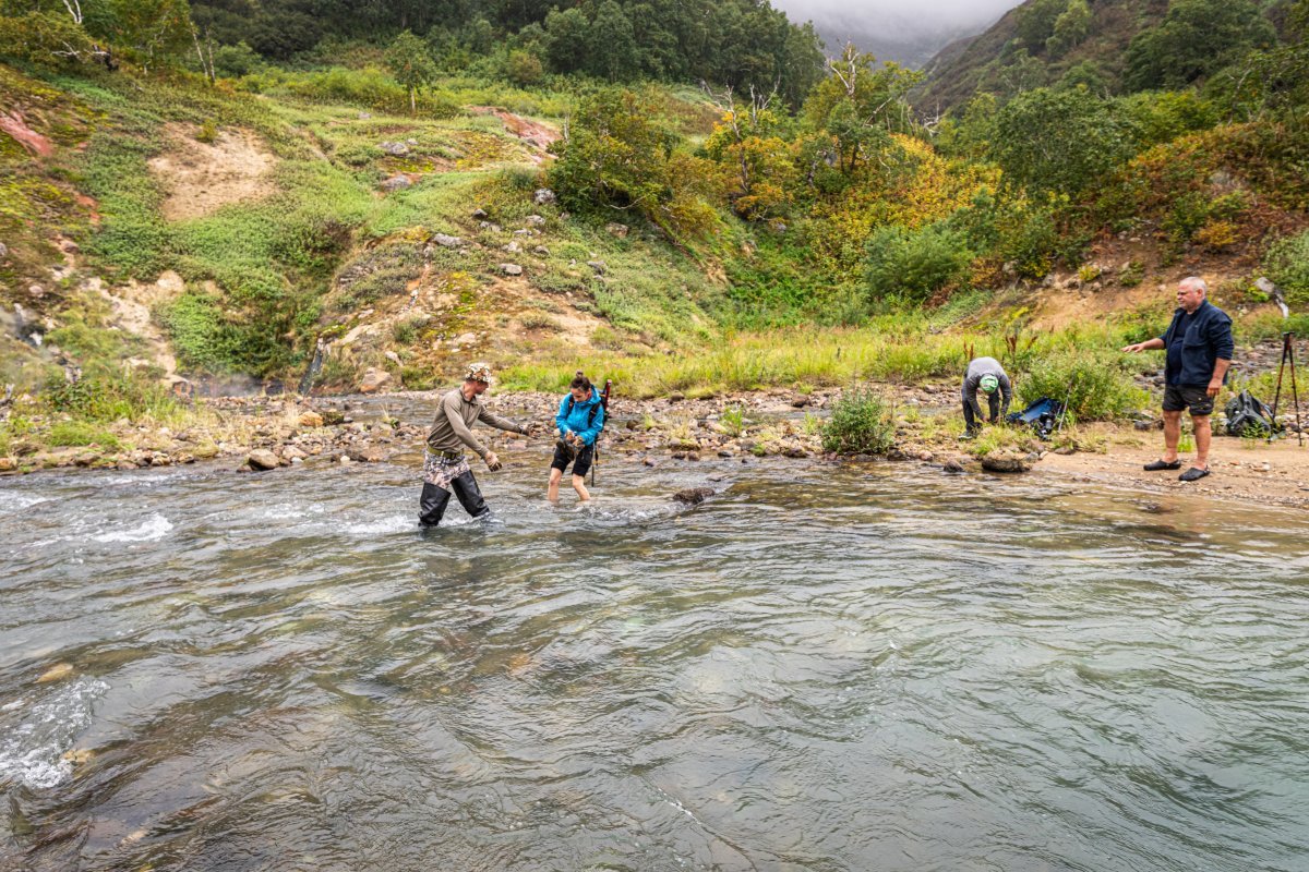 2. Примерно 6 часов хотьбы в условиях разнообразного "комфорта" (или дискомфорта) тропы (или же её отсутствия на спуске в Долину Гейзеров) - и мы там. С этой стороны туристам Долину Гейзеров не показывают - их высаживают на противоположном склоне и гуляют по специально проложенным тропинкам. Единственный известный мне способ насладиться альтернативными видами - идти пешком из кальдеры Узон (или же с кордона Глухой). И покажут здесь совершенно другие картинки: "Витраж" - группа гейзеров соорудила вот такое природное чудо: Речка Гейзерная - она немного тёплая... Ну, не слишком холодная Так что, форсировать её вполне себе комфортно: И даже радостно! Картинки вдоль реки - ай, хороши. И гейзеры извергаются прямо перед твоими глазами! Пар пошёл - это завершающая стадия работы гейзера. Всё, пришли!