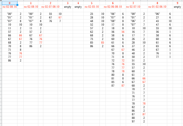 А если для вычисления трёхзнаков "не-002" применить оптимизацию и фильтрацию, которая вон там, где найдены все "не-004", то получается вот так => 1 => 1+"01" = -1+"03" = 2 => not "01,03", всего 11 вариантов, решены все. 0 => поскольку все '1' решены без склеиваний, то "ноль" решается аналогично. 2 => 2*"01" = V(2+"02") = V(-2+"06") = 2 => not "01,02,06" - а таких нет, все двузнаки дают либо 1, либо 2, либо 6. 4 => все "двойки" решены без склеивания, то "четвёрку" решать не надо. 5 => 5-"03" = V(5-"01") = -5+"07" = 2 => "07" никаких выгод не даёт, остаётся not "01,03" - как в случае с '1' там 11 вариантов. 6 => V(6-"02") = -6+"08" = 6/"03" = 2 => not "02,03,08" - там тоже 11 вариантов, из которых не решены 6, они переносятся в '3'. 3 => 6 вариантов из '6', решены все, 'девятке' ничего не остаётся. 9 => пусто. 7 => 7-"05" = V(7-"03") = 2 => not "03,05" = 39 вариантов (семёрка по традиции самая замороченная цифра). 8 => 8-"06" = -8+"10" = V(V(8*"02")) = 2 => not "02,06,10" = 6 вариантов. Итого, "вручную" надо подсчитать только 11 + 11 + 11 + 6 + 39 + 6 = всего 84 комбинации. Вот они все: aaa-not-002.xods