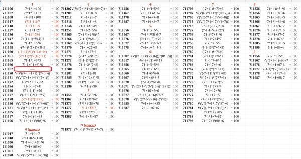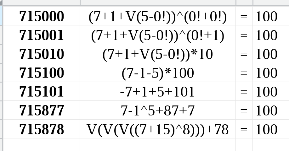 Не-005. Наконец-то потребовалось 0!+"04" = 0+"05"= -0!+"06" = 5 not "04,05,06" = 14 штук. 1+"04" = 1*"05" = -1+"06" = 5 // аналогично, если без конкатенаций. 2+"03" = -2+"07" = 5 not "03,07" = 40. 3+"02" = -3+"08" = 3!-"01" = 5 not "01,02,08" // <= '6', 03!=6, если без конкатенаций. 4+"01" = -4+"09" = V(4)+"03" = -V(4)+"07" = 5 not "01,03,07,09" = 11. // "07,09" не требуются, "01,03" работают. 5*"01" = -5+"10" = 5 not "01,10" = 14. 6-"01" = 5 not "01" = 22. 7-"02" = 5 not "02" = 32. 8-"03" = 5 not "03" = 55. 9 <= '3', V(9)=3, если без конкатенаций. То есть, подсчитать нужно вот это: aaa-not-005-start.xods Результат: "не-005" = 96 вариантов. aaa-not-005.xods 000 352 707 807 952 001 358 708 817 958 010 428 717 826 011 448 718 828 068 457 727 846 077 468 747 848 078 486 752 853 087 625 754 855 100 626 755 856 101 646 756 857 110 652 758 859 111 657 760 860 168 658 761 861 177 662 767 865 178 668 770 866 187 672 771 868 222 682 777 870 228 684 778 871 238 685 780 877 242 686 781 878 248 787 882 253 888 256 257 259 265 266 268 278 286 288