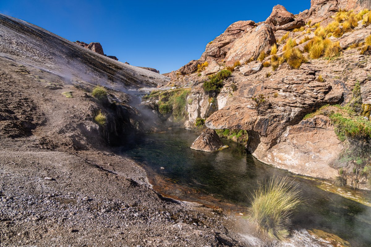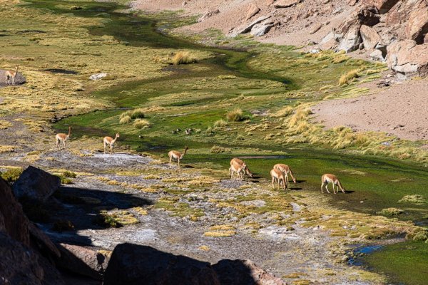 Атакама хоть и пустыня, но весьма богата каменными структурами. Ну, примерно как Вади-Рам в Иордании и Вади-аль-Дисах в Саудовской Аравии, да и наверняка много где ещё, но в конце очень длинного дня вспоминать непросто.. Камушки здесь разнообразны, разноцветны, разбросаны на значительных территориях: А также прогулки по каньонам-ущельям тоже в списке туристических развлечений: А какие дизайнерские ландшафты здесь показывают! Однозначно 5К. Но не только бездушные каменюки водятся в просторах чилийской Атакамы. Есть и живность разнообразная, хоть и не очень богатая по численности. Пустыня, однако... А также - тропик Козерога. // Повторно, впервые было в Намибии в 2020-м. Лагуны красавы! - но вода в них солоноватая, рыбы нет. Геотермальные поля, которые здесь называют "гейзерами" - но на самом деле это "пульсирующие источники": Хоть и дымят на рассвете они вполне себе пристойно, по-гейзерному: Обещали купание в горячих ваннах, но водичка там оказалась какой-то слишком ошпаривающей температуры: Местная живность у горячих вод тусуется: