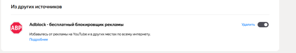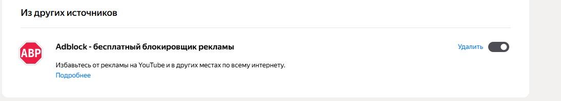 Всем здравствуйте, кто читает эту тему, у меня такая проблема, открываются рекламные сайты, такие как Bybit и открывается вводя referal код и после этого у меня вылетает с моего байбита, я подозреваю что это расширение Adblock, потому что я не могу его удалить, когда я удаляю его оно заново скачивается и пишет, такое сообщение, как на скрине пытался удалить через папки в Yandexbrowser. но все равно устанавливается по таймеру, скачал антивирусники тоже не помогли.