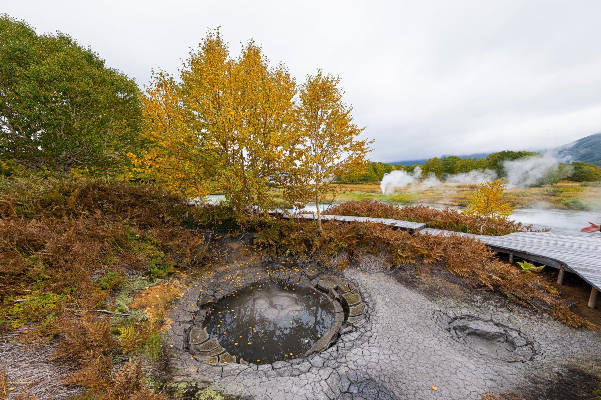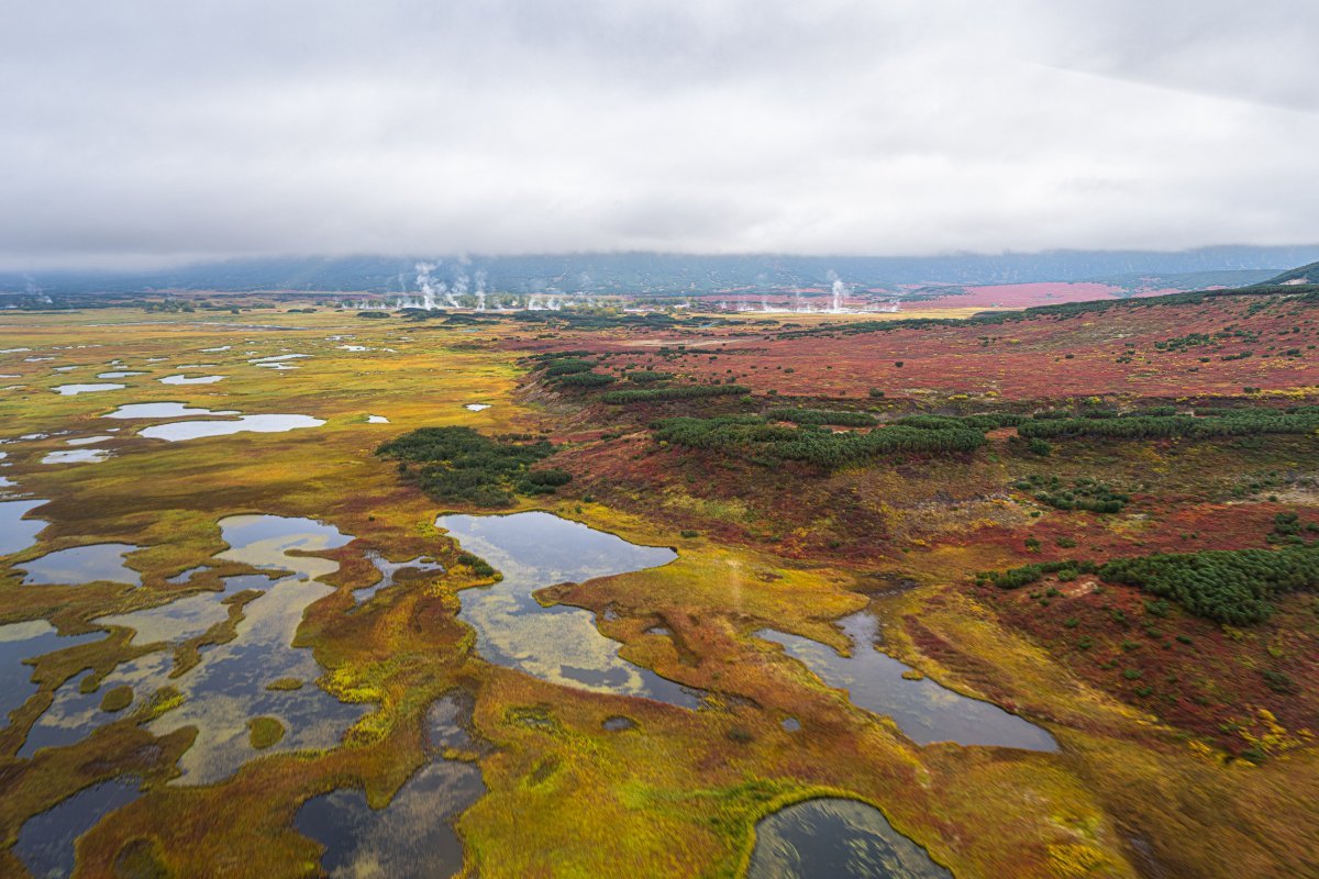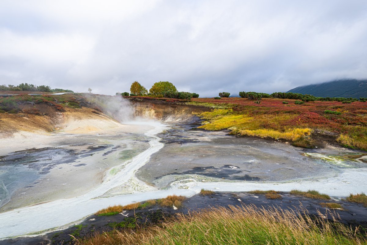 Много разного и интересного произошло за прошедшую неделю - она была весьма насыщенной на самые разнообразные события. И рекордный по длительности и расстоянию перелёт, и новые для места вроде Рапа-Нуи (Остров Пасхи), и старые-добрые знакомые водопады Игуассу. Но всему этому надо дать немного отлежаться, посему возвращаюсь к Камчатке. Там есть ещё долги. И немалые. Продолжу, наверное, рассказом про кальдеру Узон. Бывал здесь уже раз ... гадать не буду, а просто подсчитаю... аж 5 раз! И ведь не надоедает! Но всегда гулял здесь только летними июльскими или августовскими деньками. И много раз слышал, что осенние краски тут совершенно иные, яркие и волшебные. Посему (повторюсь) в этом году мы и решили вернуться в эти края осенним сентябрём, в самом конце туристического сезона. И не ошиблись. Смотрите сами: Увы, вот слишком серое небо немного подпортило картинку. Под ярким солнышком это всё смотрелось бы совершенно фантастично: Но всё равно - обалденные виды! Осенние листья на камчатской берёзе просто дизайнерские: