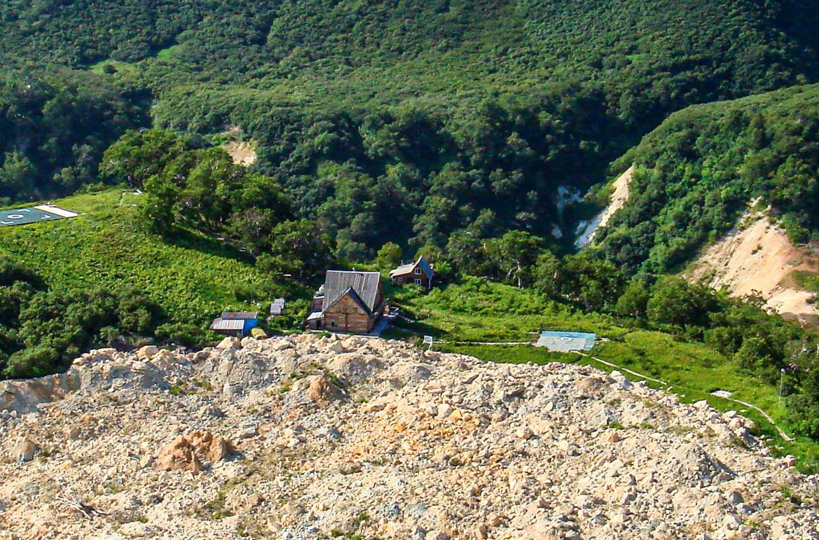 В июне 2007 года здесь произошла природная катастрофа. Кусок горы прямо над кордоном ДГ как ножом срезало, и на долину сошел оползень: Сель перегородила речку Гейзерную и в результате получилось вот такое грязноватого цвета подпорное озеро: "Ааа!!! - катастрофа! Долина Гейзеров уничтожена!" - вопили разные природоориентированные всепропанцы. "Да и ладно, не в первый раз.." - подумала Долина Гейзеров про этот самый оползень. Что самое интересное - оползневые потоки могли смести напрочь постройки в ДГ, но остановились буквально в метрах от них! Вот такие фотки мне прислали в том 2007 году: Как такое могло произойти? Какой невиданной силы карма у этого кордона?? Слегка пострадал только железный сарайчик с электрогенераторами.. Вот как такое чудо могло произойти? В метре от самой критической инфраструктуры - взяло, да и остановилось! Увы, несколько гейзеров затопило - но уверен, что всё это временно. Туристическую инфраструктуру тоже затронуло. С тех пор на ту сторону любопытных туристов больше не водят..