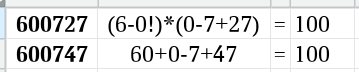 Итого, все "семёрки" разобраны! По дороге было немало нетривиальных решений: 711167 => 71+1+V(16)*7 = 100 767177 => (-7+6!-7+1-7)/7 = 100 767707 => (-7+6!-7-7+0!)/7 = 100 771767 => (-7-7+1-7+6!)/7 = 100 776770 => (7!-7!/6) / (7*(7-0!)) = 100 776771 => (7!-7!/6) / (7*(7-1)) = 100 776777 => (7!-7!/6) / (7*7-7)) = 100 Не решены: решены!.. но пока не все. 777707 777717 777767 777778 Дальше - "шестёрки".