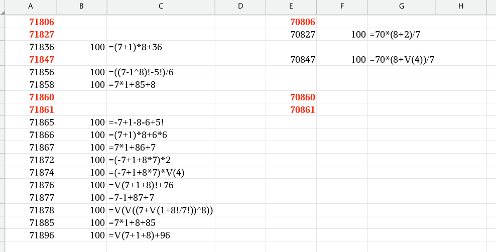 Что-то очень вязко... Не получилось аж 30 25 23 пятизнака: 70600 71600 70601 71601 70602 71605: 70+60/2 =100 / ( -(7)V(1)/6 + 0!)*5! = 100 70607 71607 70611 71611 70612: 71615: (-70+(6-1)!)*2 = 100 / ( -(7)V(1)/6 + 1)*5! = 100 70617 71617 70621 71621 70668 71630 70-6+V(V(6^8)) = 100 70670 71647 71+6^V(4)-7 = 100 70671 71661 70677 71668 70678 71660 V(V(70*6!/7!)^8) = 100 70681 71670 71671 71681 706xx-716xx.xods
