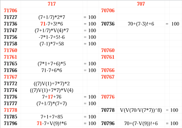 Не решил 11 6 вариантов: 70706 70760: V(7!+0!)+V(7!/6+0!) = 100 70761: V(7!+0!)+V(7!/6+1) = 100 70766: V(7!+0!)-7+6*6 = 100 70767 70776 71706 71760: V(7!+1)+V(7!/6+0!) = 100 71761: V(7!+1)+V(7!/6+1) = 100 71767 71778 707xx-717xx.xods