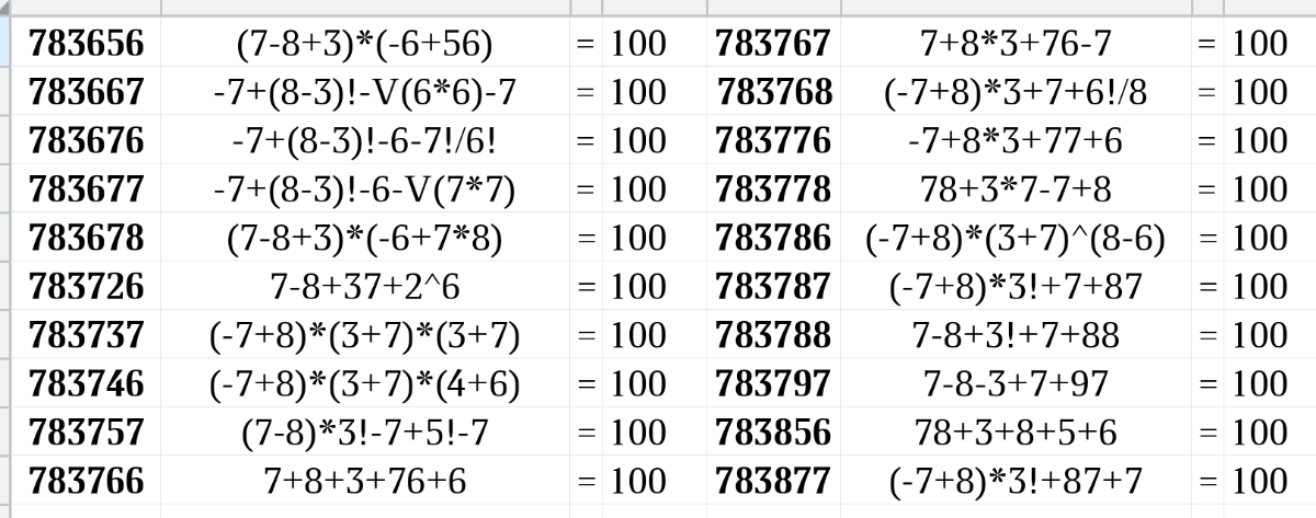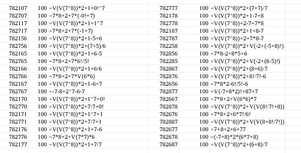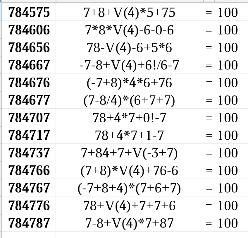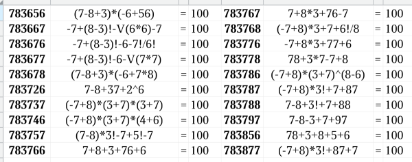 782 78-2 + "004"! = 76+24 = 100 - "не-004" как-то многовато вариантов.. Смотрим четырёхзнаки: 7820 <= "7821" 7821 7+V(8+2-1) = 10, 78-2+(1+"03")! = 78-2+(-1+"05")! = 100 not "02,03,05,10" =12 штук. 7822 78+22 = 100, 7+82+2 = 91 not "01,02,09,10" =2 штуки (конкатенация '2', четвёрку считаем отдельно) 7823 <= "7826" 7824 78-2+4! = 100, 78+2^4 = 94 not "01,02,06,10" empty. 7825 78-2+(5-"01")! = 100, (-7+8)*2*5 = 10, 78+25 = 103, -7-V(8^2)+5!=105 not "01,02,03,05,10" empty. 7826 (-7+8)*V(-2+6) = 2, 78+2*6 = 90, 7+82+6 = 95, 7*8*2-6 = 106 not "02,05,06,10" 6. // '10' бесполезна. 7827 7+8+2-7 = 10, 7*8*2-7 = 105, 78-2+(7-"03")! = 100 not "02,03,05,10" =12. 7828 (-7+8)*(2+8) = 10, 78+28 = 106 not "02,06,10" =6. 7829 <= "7623" Итогl = 38 вариантов. 782107 782707 782117 782717 782156 782756 782165 782765 782166 782766 782167 782767 782170 782770 782171 782771 782176 782776 782177 782777 782178 782778 782187 782787 782258 782856 782285 782867 782876 782656 782877 782667 782878 782676 782887 782677 782678 782687