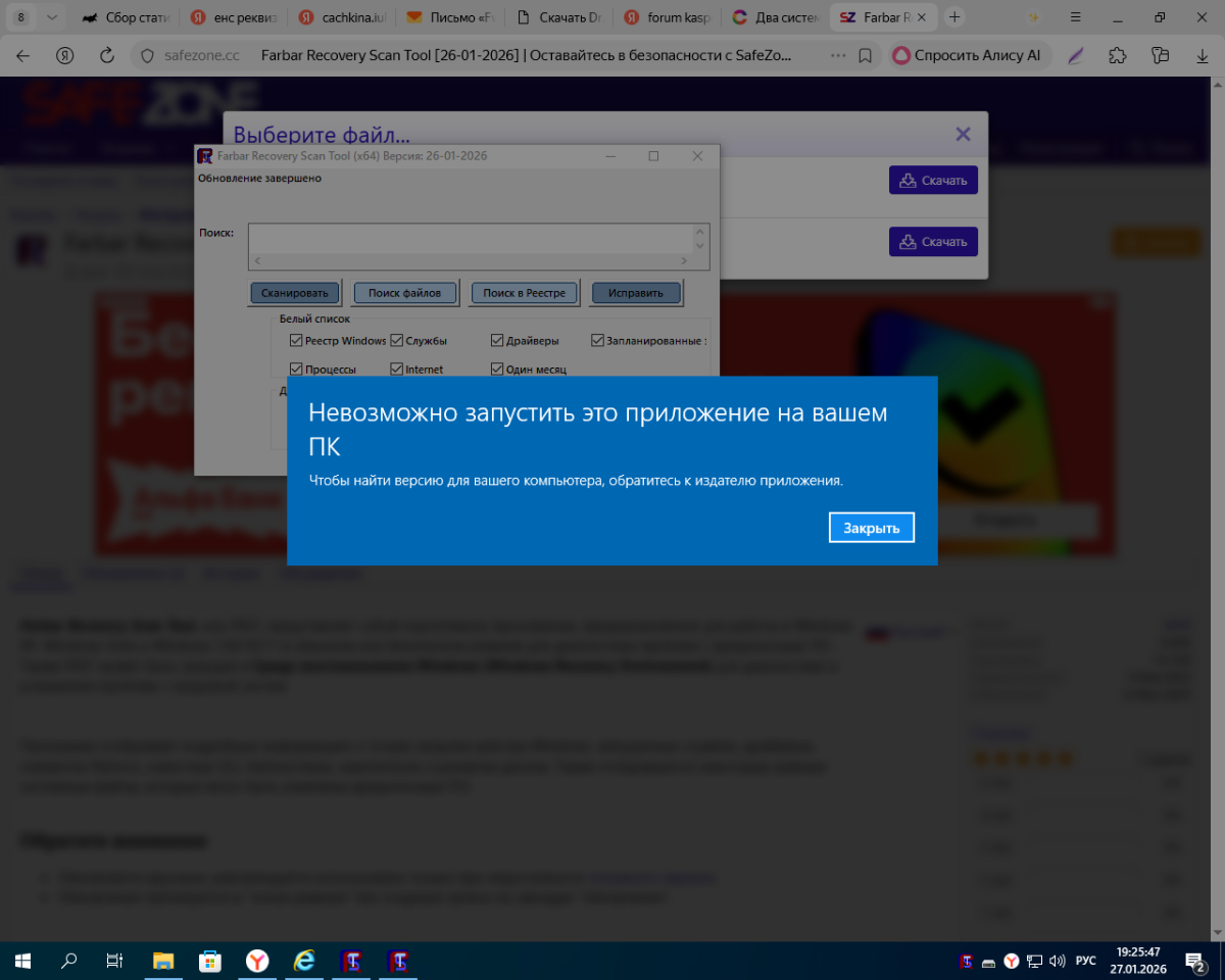 Скачивал с зеркала. FRST не открывался по причине не соответствия версии windows, а FRST64 запустился. После обновления у меня появляется предупреждение про то, что невозможно запустить на данном ПК. Повторное включение программы выдаёт аналогичную ошибку -