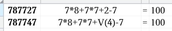 786 7*(8+6) +"002" = 7+86 + "007" = 100 not "002,007" - пусто! Ноль вариантов для "ручной работы". 787 7*(8+7) - "005" = 7+87 +"006" = 100 not "005,006" = всего два варианта. 787727 787747 Готово - 787xxx.xods В "семёрках" остаётся только 788.