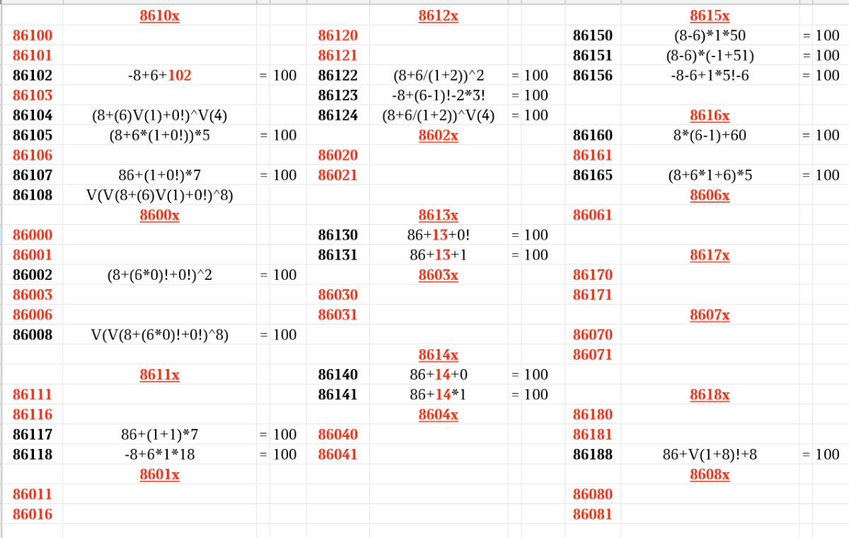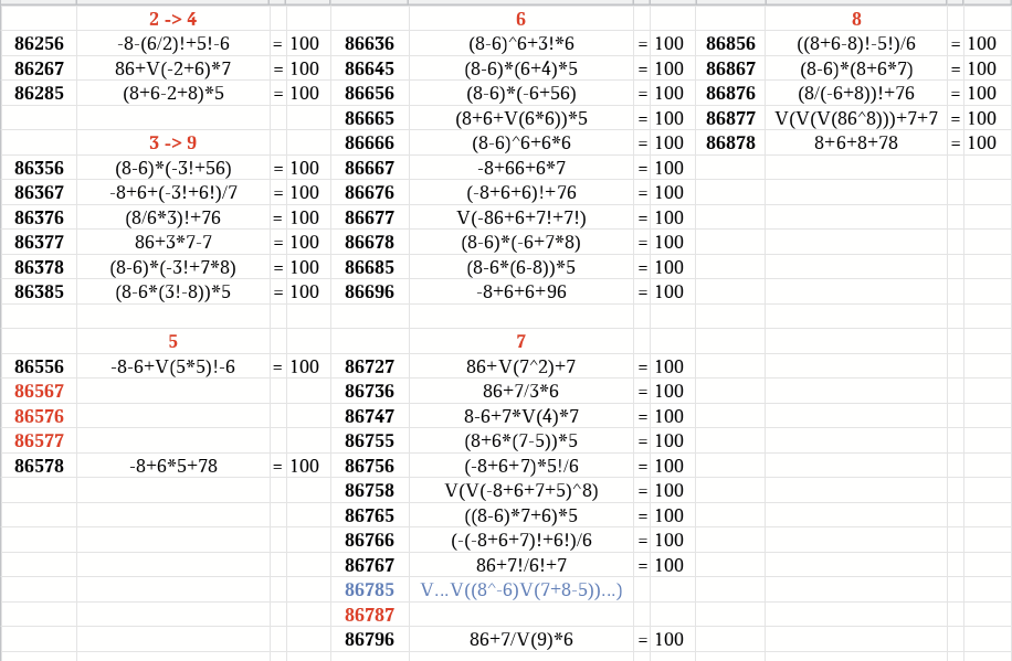А также: -8+6!/6 = 112 Есть улучшения! Но всё равно как-то много красного для 860xx/861xx. Не получилось решить аж 30 комбинаций: 86000 86020 86070 комбинации 86-"010" решаются через V(V( ... 17 штук ... (V(8^-6)V("010)) ... ) 86001 86021 86071 86003 86120 86170 86006 86121 86171 86100 86030 86080 86101 86031 86081 86103 86040 86180 86106 86041 86181 86011 86061 86016 86161 86111 86116 Таблица: 860xx-861xx.xods