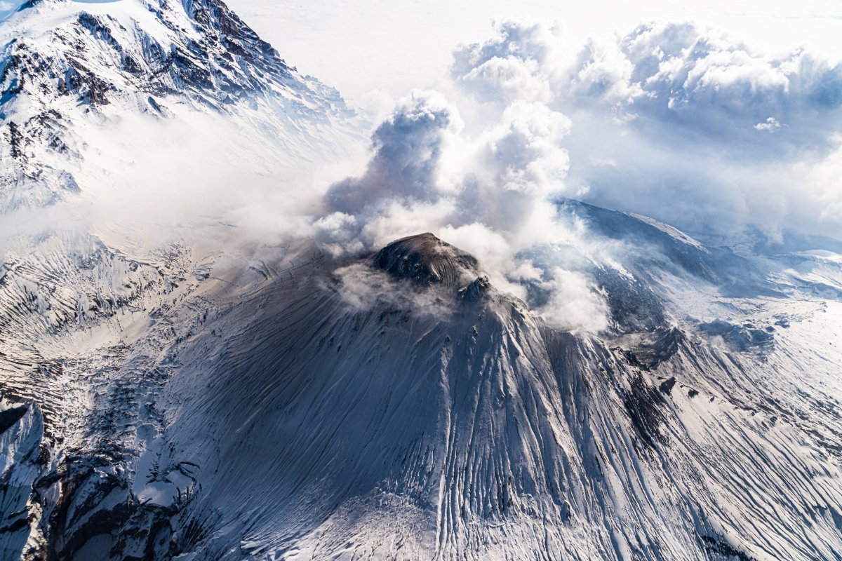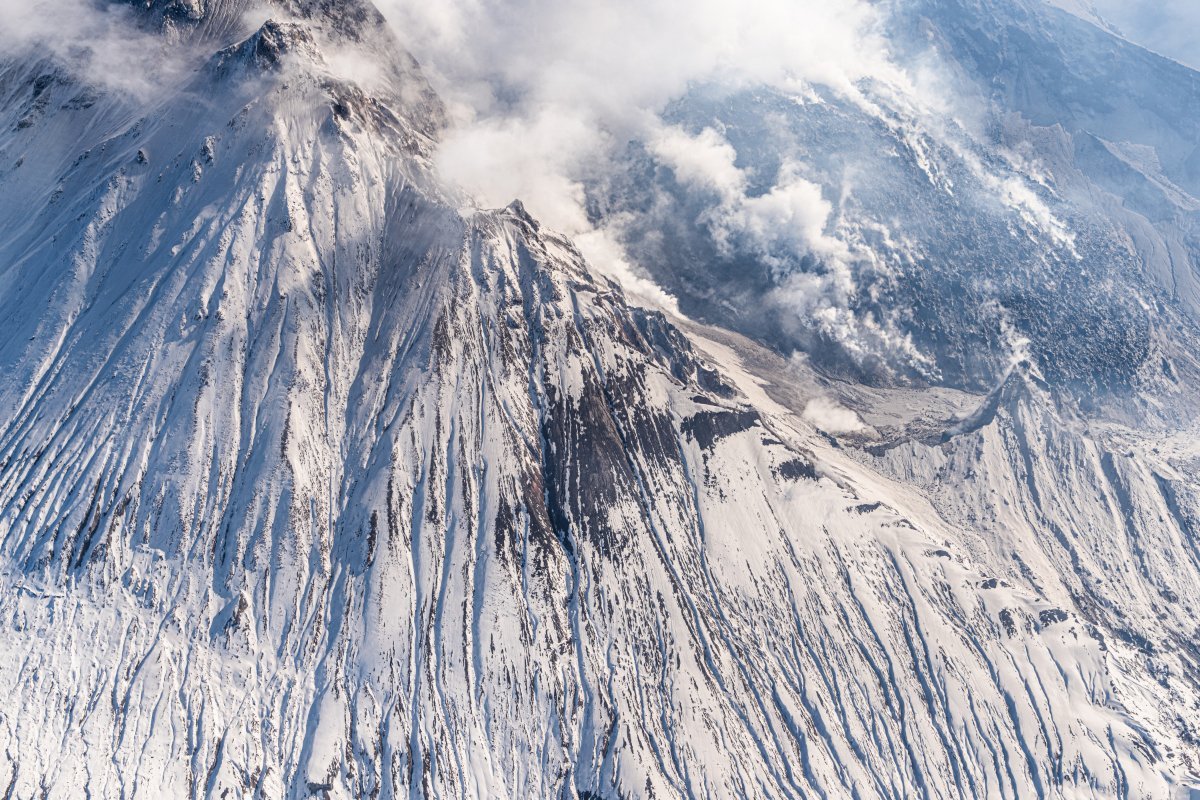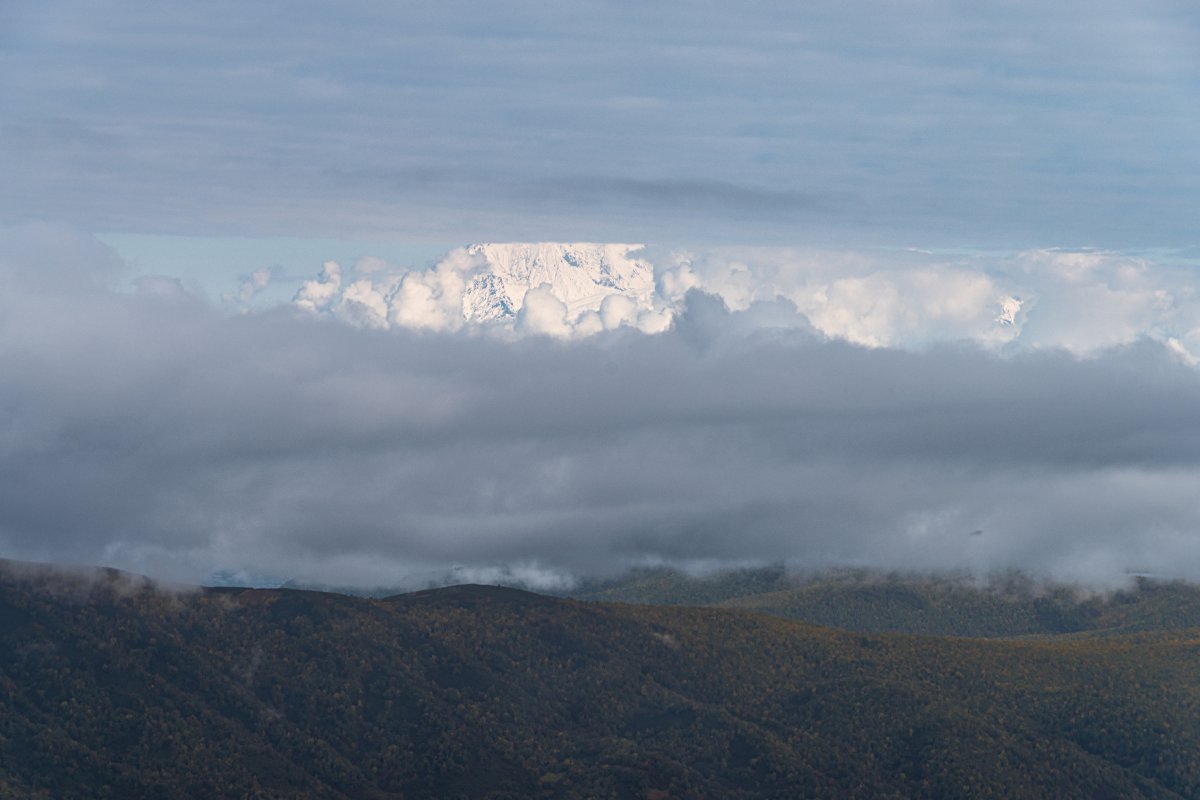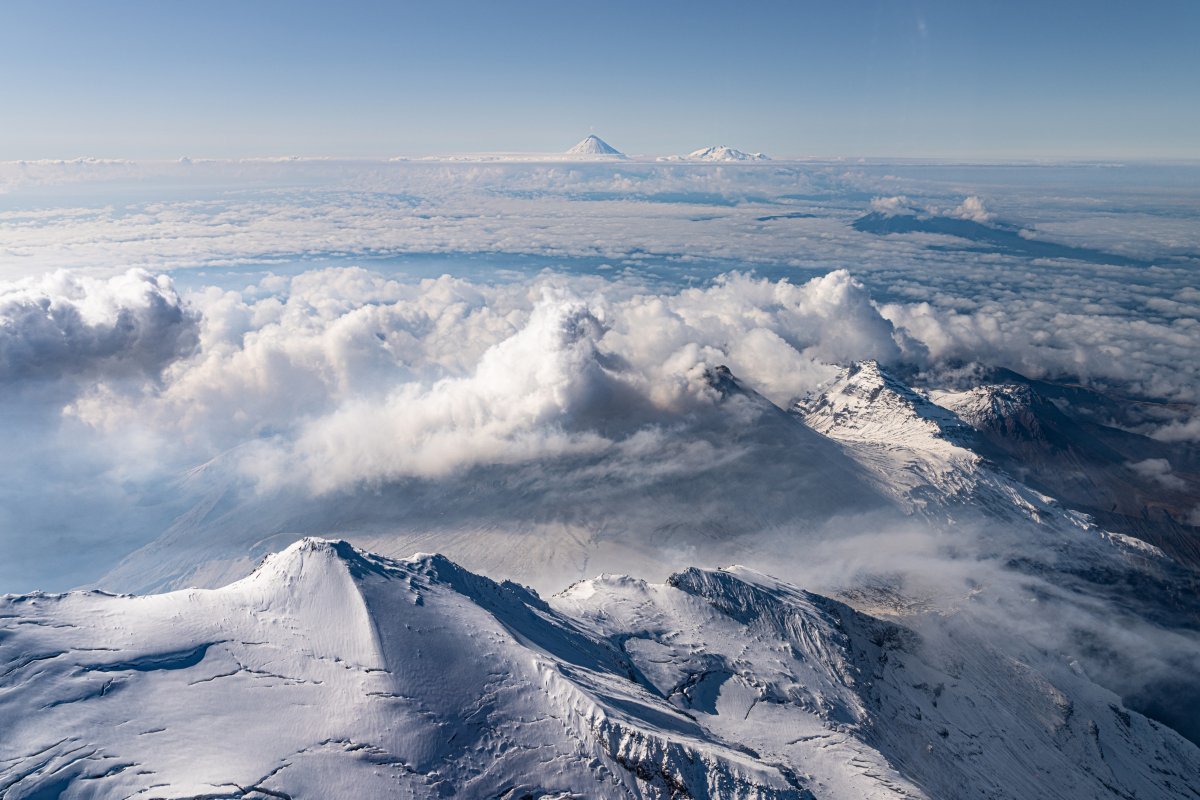 11. Ура-ура! Погодка решила одуматься и дать нам немного солнышка. Сначала после обеда, потом после полудня, а дальше день за днём всё становилось всё ярче и солнечней. И мы попытались осмотреть пока ещё не осмотренное. Начиная с самого главного северного вулкана Шивелуч. Вот он, красавец: Это один из самых активных вулканов Камчатки. Пыхает не просто регулярно, а иногда и весьма злобно - бывали случаи, когда после очередного "пыха" Шивелуча закрывали самолётное небо над Аляской(!) - а это, пардон, более 2000 км! То есть, вулкан знатный. Надо лететь и смотреть... - и уже не в первый раз такие планы. В прошлый раз обломались по трём последовательно происходившим причинам: сначала военные учения в том регионе, потом погоды не было, потом другой вулкан "пыхнул" и засыпал пеплом сотни километров в округе (свой вертолёт в вулканическую пыль я гонять не буду!) - то есть, в прошлом году не получилось, значит, надо в этом. Но погода-поганка опять нам все планы спутала! ... К счастью, временно. И в какой-то очередной день нам сообщили, что прогноз хороший, надо лететь! - и полетели.. Но сначала нам показывали только какие-то проблески нормальных климатических условий.. Но чем дальше на север - тем больше солнышка, тем ярче краски, тем виднее виды во все стороны! А вот и Шивелуч показался ->