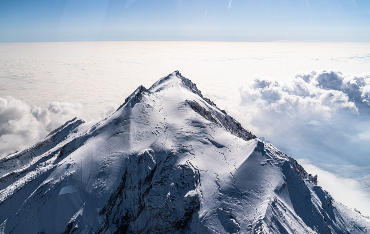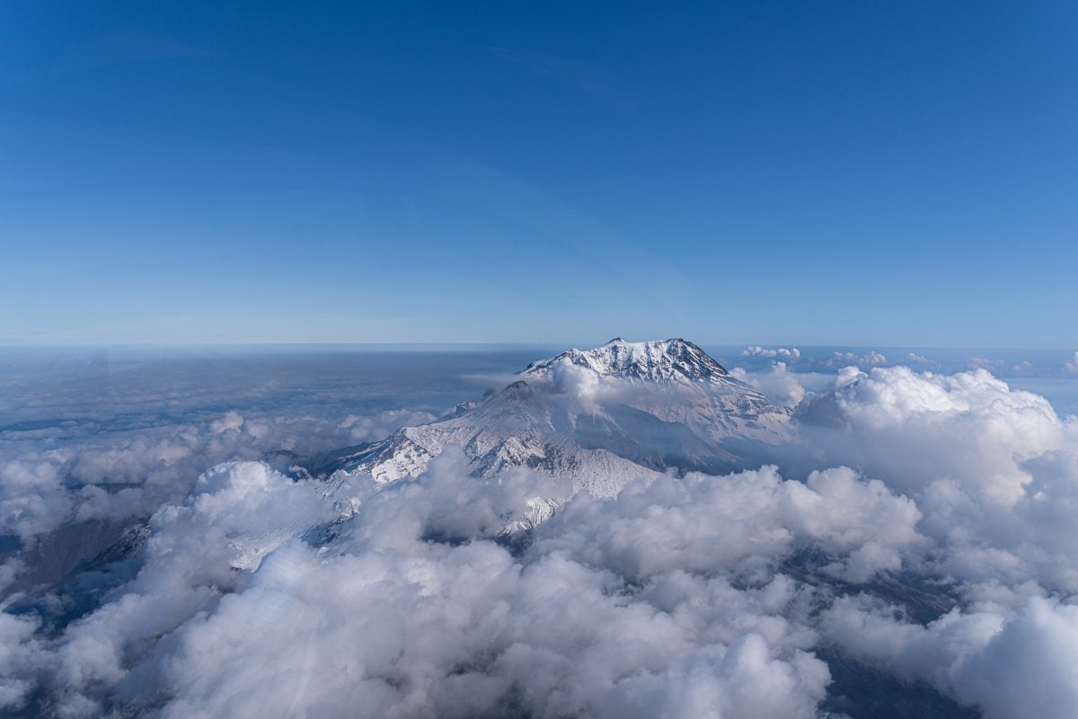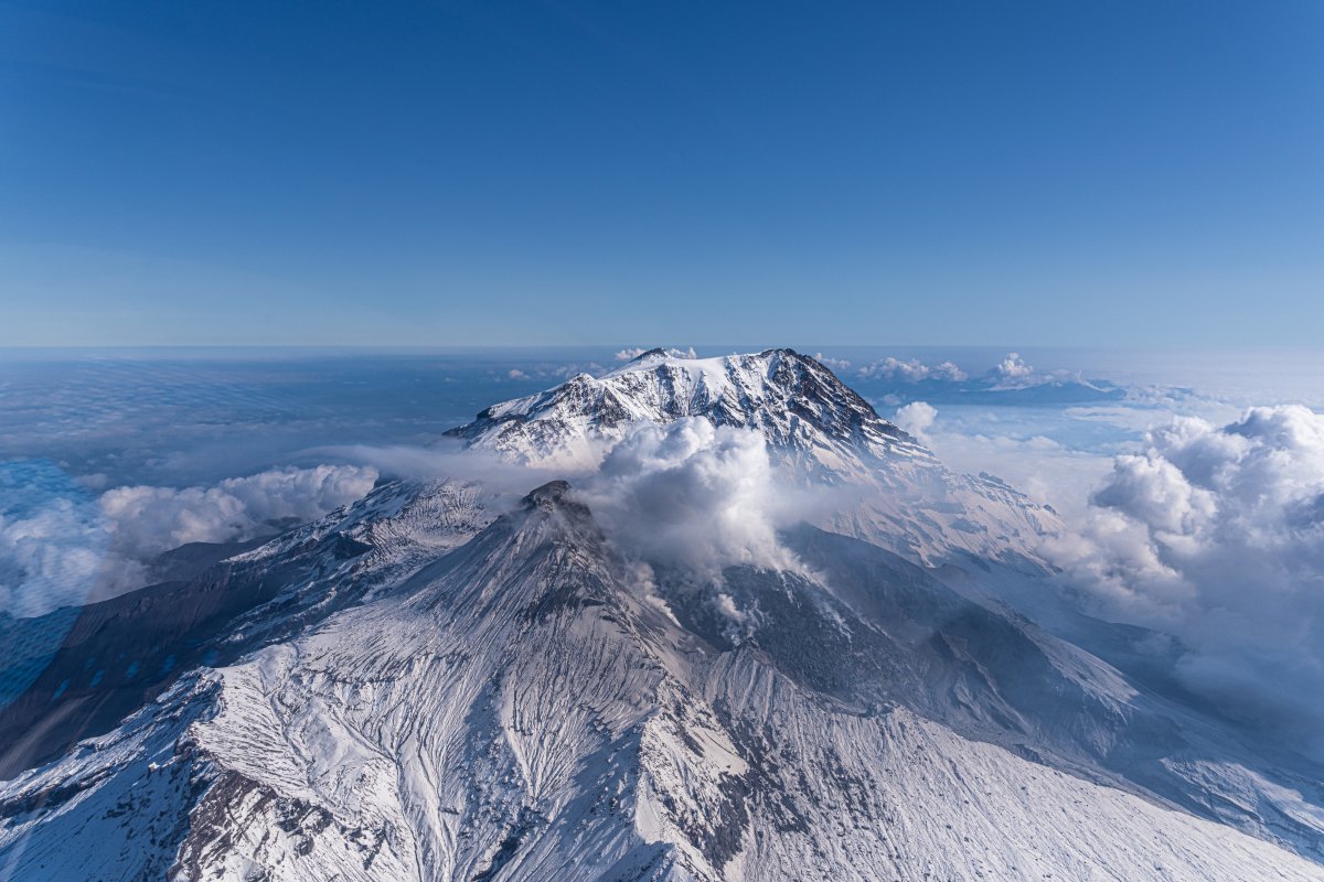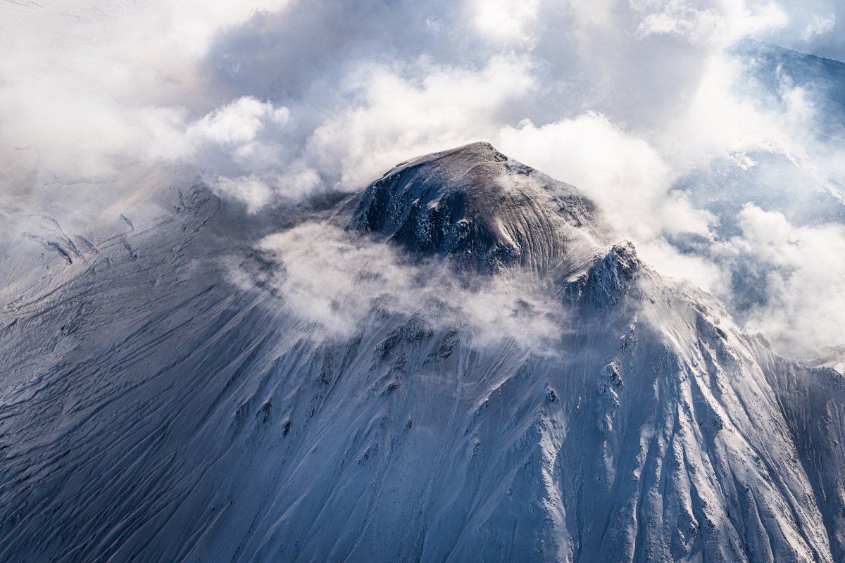 11. Ура-ура! Погодка решила одуматься и дать нам немного солнышка. Сначала после обеда, потом после полудня, а дальше день за днём всё становилось всё ярче и солнечней. И мы попытались осмотреть пока ещё не осмотренное. Начиная с самого главного северного вулкана Шивелуч. Вот он, красавец: Это один из самых активных вулканов Камчатки. Пыхает не просто регулярно, а иногда и весьма злобно - бывали случаи, когда после очередного "пыха" Шивелуча закрывали самолётное небо над Аляской(!) - а это, пардон, более 2000 км! То есть, вулкан знатный. Надо лететь и смотреть... - и уже не в первый раз такие планы. В прошлый раз обломались по трём последовательно происходившим причинам: сначала военные учения в том регионе, потом погоды не было, потом другой вулкан "пыхнул" и засыпал пеплом сотни километров в округе (свой вертолёт в вулканическую пыль я гонять не буду!) - то есть, в прошлом году не получилось, значит, надо в этом. Но погода-поганка опять нам все планы спутала! ... К счастью, временно. И в какой-то очередной день нам сообщили, что прогноз хороший, надо лететь! - и полетели.. Но сначала нам показывали только какие-то проблески нормальных климатических условий.. Но чем дальше на север - тем больше солнышка, тем ярче краски, тем виднее виды во все стороны! А вот и Шивелуч показался ->