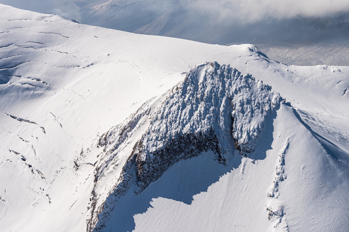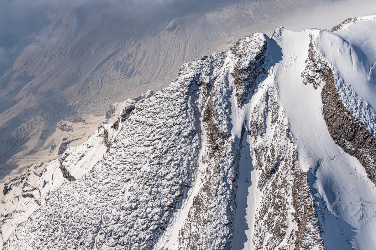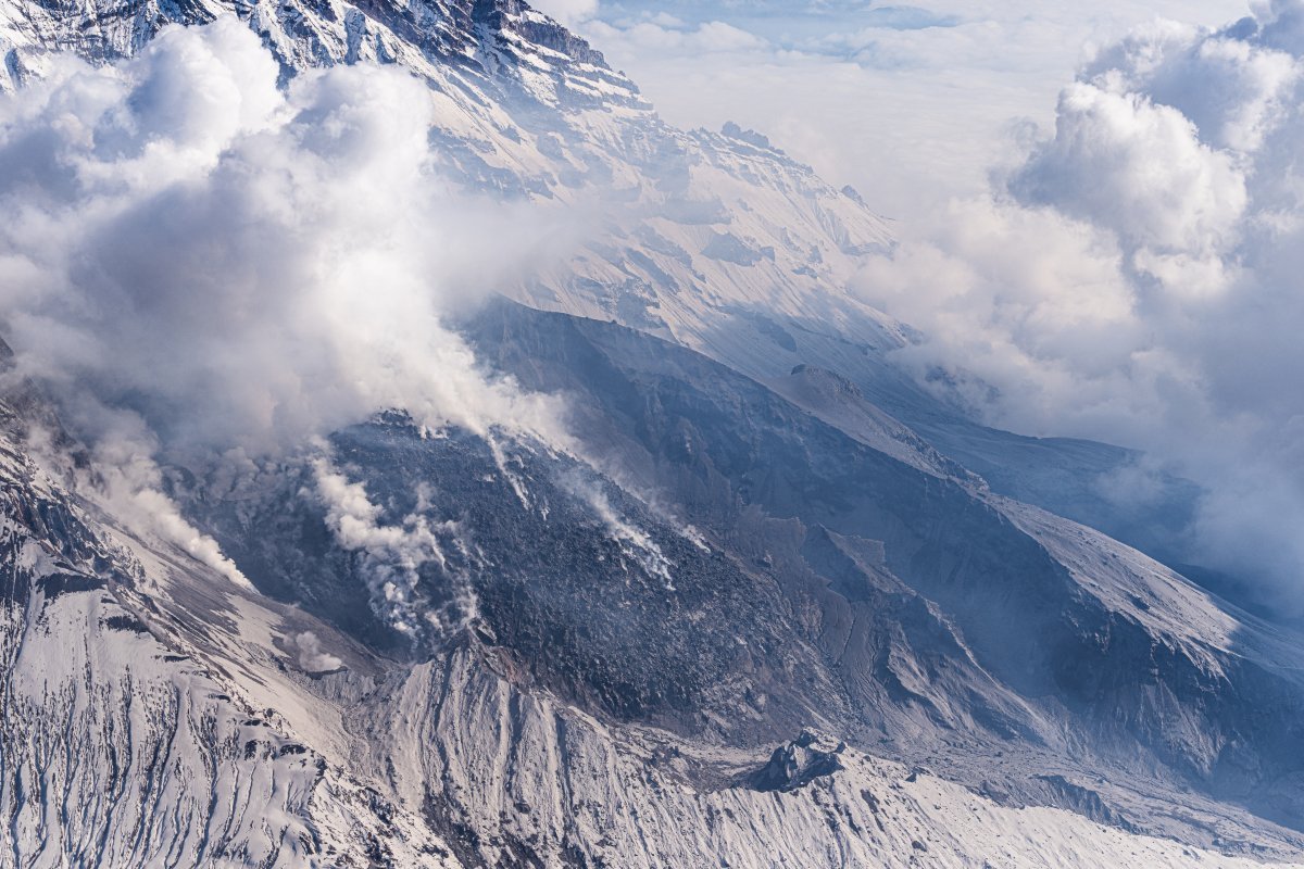 4. Облёт Шивелуча. Вид со стороны "воротника" - Новый конус растёт. Надолго ли? Сколько по времени он выдержит? Тот факт, что там однозначно выдавливаются породы (это видно по "волдырю" на вершине) - значит, оно скоро снова "долбанёт", и весьма нехило.. Увы, облачность "на поясе вулкана" не дала нам осмотреть всё великолепие.. Посему - не считается. Шивелуч мы видели, но не целиком! Облёт вершины (где "воротник" вулкана) - А вот обратите внимание на эти лавовые потоки: Вот именно эти: Видно же, что они текли откуда-то сильно выше. То есть, не так уж и давно (несколько тысяч лет назад) этот вулкан был заметно более "стройным". Но, повыше он был и лаву пулял из своего верхнего кратера в больших объёмах. Потом же он по каким-то прочинам провалился внутрь, усох - и только вот эти лавовые потоки свидетельствуют о его былом величии.