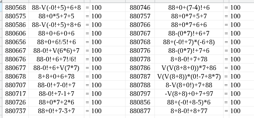 Готово. Проверяйте 878xxx.xods Особо хороши вот эти: V(V(8!/7!+8))*(7*7+0!) = 100 8+V(V(V(7^8)))+7+78 = 100 (8!/7!+V(V(8+8)))*(5+5) = 100 Да и в целом там непросто было...