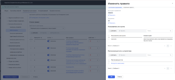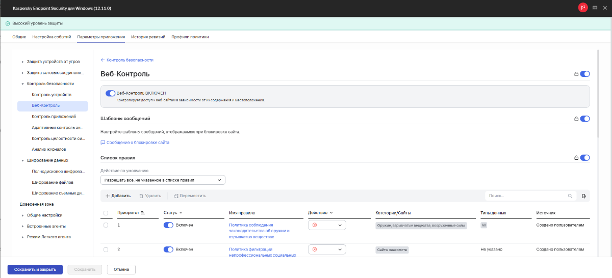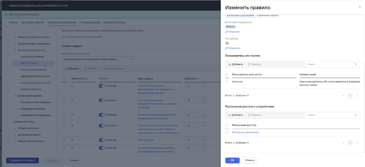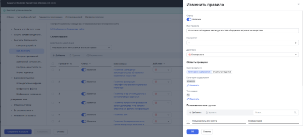 Всем привет. Агент администрирования 16.0.0.43 Версия антивируса Kaspersky Endpoint Security для Windows 12.11.0.637 Пытаюсь заблокировать переходы по содержанию, через встроенную категорию в Веб-Контроле. Протестировав - якобы работают эти политики ограничения в самом КЕСе, по факту исходя из браузера работают на множественных компах переходы по сайтам (подобия материала для взрослых и т.д) (браузер - Хром) Чуть истории, настраивал я ещё на 12.10, тестил всё работало. Обновился до 12.11 - не работает та же настройка.