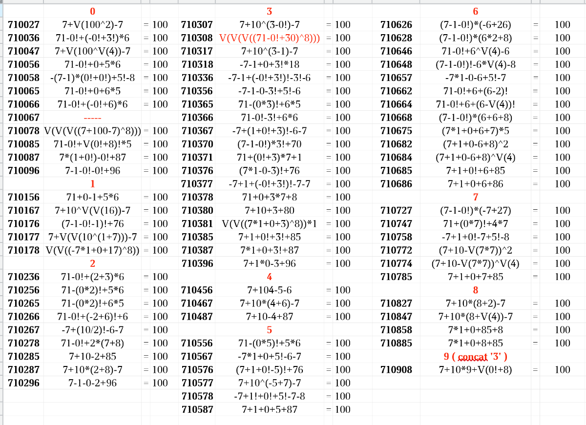 Итого: не смог решить только 1 случай: 710067. Помогайте. 710xxx.xods Интересного достаточно: 7+V(100^V(4))-7 = 100 V(V(V((7+100-7)^8))) = 100 V(V((-7*1+0+17)^8)) = 100 V(V(V((71-0!+30)^8))) = 100 (7-1-0!)!-6*V(4)-8 = 100 (7+1+0-6+8)^V(4) = 100 7+10*9+V(0!+8) = 100