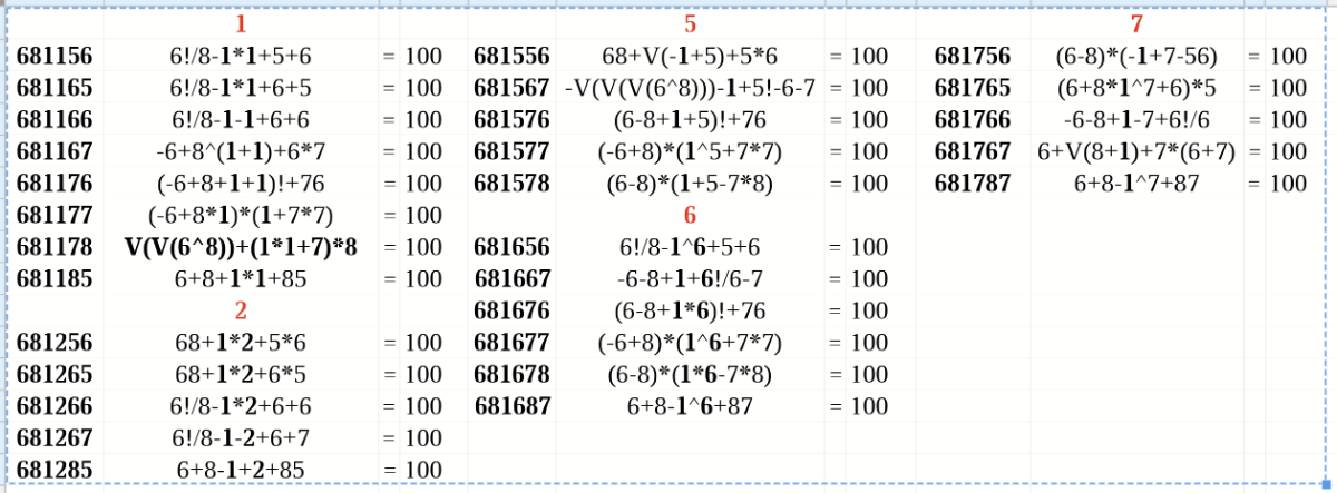 // форумный движок криво копи-пасты из таблиц обрабатывает... я пожалуюсь Верно! У меня вот такие получились решения: 683xxx-686xxx.xods 686707 (6!-(-8+6+7)!)/(-0!+7) = 100 686717 (6!-(-8+6+7)!)/(-1+7) = 100 686767 V(V(V(6^8)))!/6-7-6-7 = 100 686778 (-6+8)*(-6+V(7*7)*8) = 100 686787 6+8+6-7+87 = 100 686856 68-6+8+5*6 = 100 686877 V(6^(8-6))+87+7 = 100
