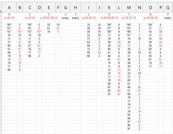 Но есть ещё "нули", "тройки" и "девятки" - вычеркнуто, поскольку есть решение для всех "троек". Результат вот здесь: aaa-not-004.xods Не удалось найти решения для 102 комбинаций: 000 100 255 525 606 700 806 001 101 267 528 607 701 827 007 107 276 548 608 706 845 010 110 552 617 707 847 011 111 557 618 710 855 057 157 562 656 716 856 066 167 568 658 717 858 067 176 575 660 726 860 068 177 585 661 728 861 070 186 586 666 737 865 071 667 746 867 076 670 748 876 077 671 750 877 086 672 751 676 755 677 757 678 760 680 761 681 766 685 767 687 768 770 771 776 777 778 782 786 787 788 797 Из позитивного. Вместо 1000 комбинаций "вручную" пришлось перебрать всего 15 (нули) + 22 (единицы) + 8 + 20 + 21 + 4 + 18 + 27 + 55 (семёрки - самая неприятная история) + 46 = 190 вариантов. Фильтрация 81% - весьма неплохо!