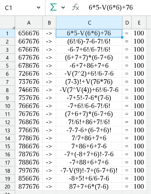 Или вот так: ( "010"-6 )! + 76 = 4! + 76 = 100 То есть, "трёхзнаки", из которых можно получить "002" или "010", вместе с "676" дают 100. Остаётся проверить те, которые не дают ни "002", ни "010". А это упражнение уже сделано вон там по этой ссылке - там всего 20 трёхзнаков "ни-002, ни-010". Остаётся взять этот список, прицепить к нему "676" и порешать арифметическую задачку: 656676 = 100 667676 = 100 676676 = 100 677676 = 100 678676 = 100 726676 = 100 737676 = 100 746676 = 100 757676 = 100 766676 = 100 767676 = 100 768676 = 100 776676 = 100 778676 = 100 786676 = 100 787676 = 100 788676 = 100 797676 = 100 856676 = 100 877676 = 100 МойОфис вам в руки!