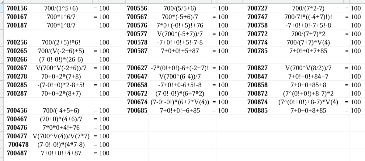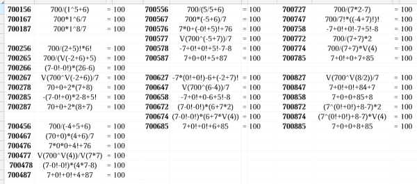 700256 --> (7 + 0 + 0 - 2)! × (5/6) = 100 700874 --> (7 + 0!) + (0! + 8 ) + 7 × 4 = 100 700758 ---> 700 - 75 × 8 = 100