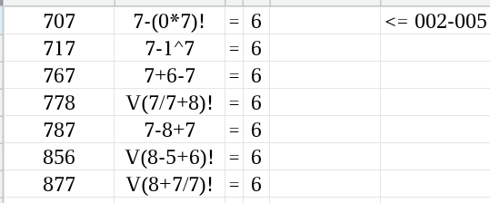А если скрестить эти два метода - то получается заметно оптимальнее! Берём список "не-004" - а это разные "def", сортируем по первой цифре "d" в разные столбцы и для каждого столбца применяем правила "ef != что там у нас уже получилось чуть выше". 8060 8+(0*6)!+0! = 10 => "ef" != "02,10" 8061 8+(0*6)!+1 = 10 not "02,10" 8062 8+0*6+2 = 10, 80+6*2 = 92 not "02,08,10" 8063 8+0+6/3 = 10, 80+6+3!=92 not "02,08,10" 8064 8+0+6-4 = 10, 80+6*V(4)=92 not "02,08,10" 8065 8+0!+6-5 = 10, -8-0!-6+5! = 105 not "02,05,10" 8066 8+0!+6/6 = 10, 80+6+6=92 not "02,08,10" 8067 8+0!-6+7 = 10, 80+6+7=93 not "02,07,10" 8068 8+0-6+8 = 10, 80+6+8=94 not "02,06,10" 8069 8-0!-6+9 = 10, 80+6+9=95 not "02,05,10" Получается вот такая картинка, красным выделены те двузнаки, из которых не сложились нужные значения. Всего осталось вроде как 38 вариантов для "ручной обработки". Табличка Моёфиса: 806xxx1.xods Вот эти оставшиеся трёхзнаки: 007 177 667 787 066 267 672 827 067 276 676 847 070 585 677 856 071 606 678 858 076 656 685 867 077 658 687 876 107 660 766 877 167 661 767 176 666 778 И, соответственно, вручную порешать надо вот такие комбинации: 806007 806177 806667 806787 806066 806267 806672 806827 806067 806276 806676 806847 806070 806585 806677 806856 806071 806606 806678 806858 806076 806656 806685 806867 806077 806658 806687 806876 806107 806660 806766 806877 806167 806661 806767 806176 806666 806778