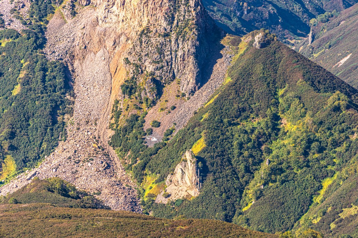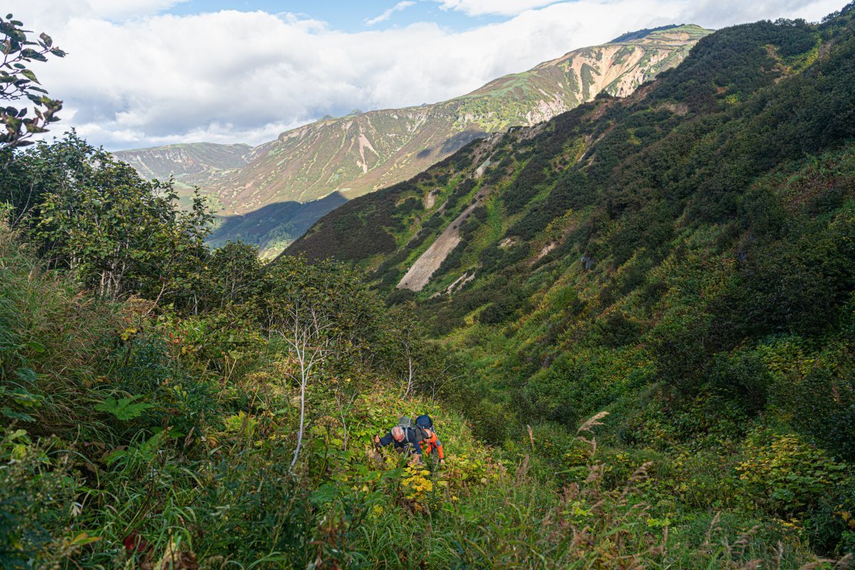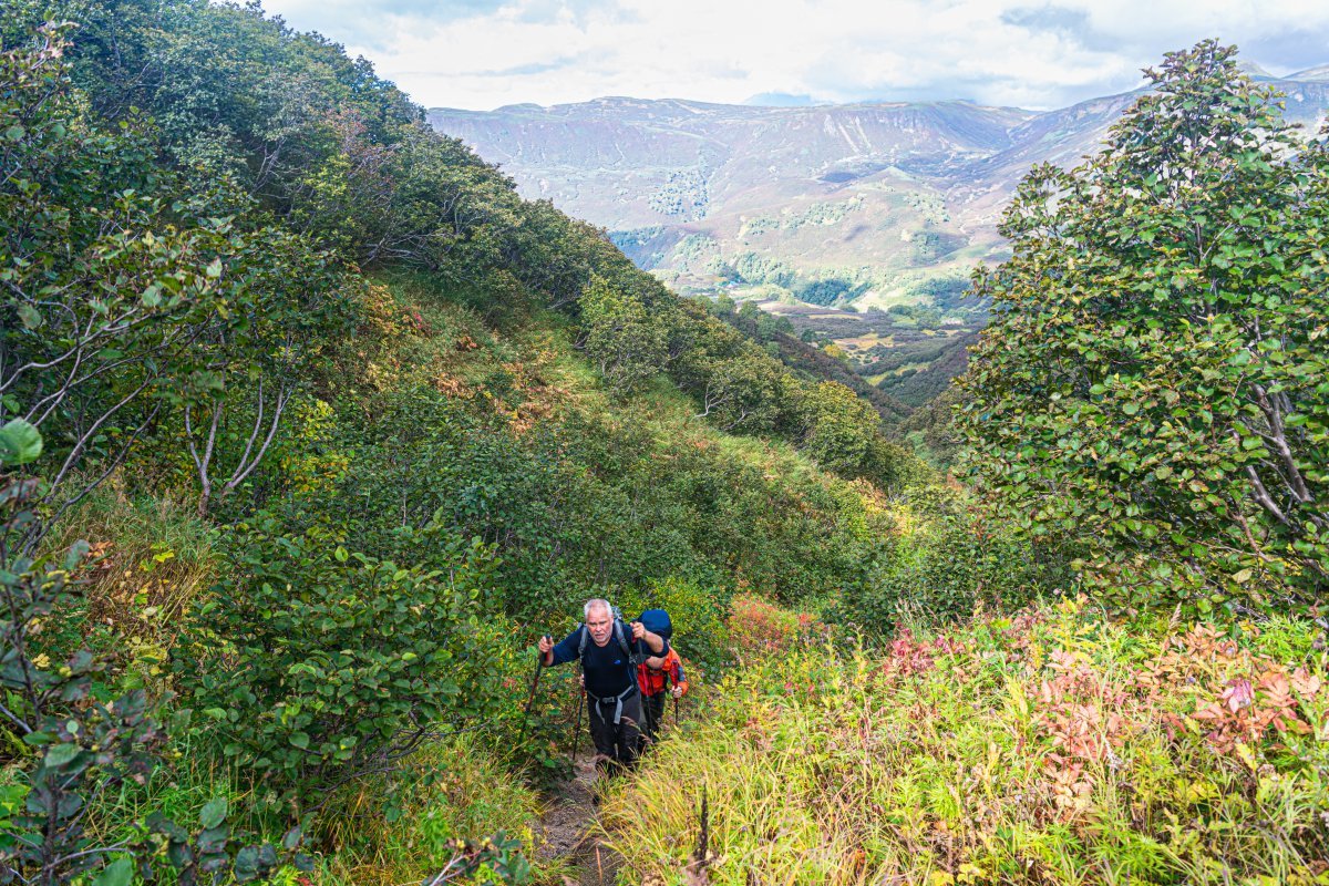 2. Вышли, гордо и уверенно прошли до дальней вертолётной площадки с характерным названием "Медвежка", там посмотрели по сторонам - ага, уже вертолёты с туристами подлетают! (беленький Ми-8 в центре фотки проглядывается). Что-то поздновато мы вышли И как только мы свернули с "обжитых дорожек", оказалось, что мир не так-то и прост и предсказуем. Подъём на эти какие-то-500 метров оказался весьма непростым. Старая туристическая тропа то появлялась, то исчезали - и корячиться пришлось через "траву-по-пояс" (с) и шаломанник по макушку.. В целом, как-то совсем некомфортно было карабкаться на эту относительно небольшую высоту.. Тропа местами попадалась - а потом снова исчезала. Да и где попадалась - она была какой-то изуверски скользкой (после недавних дождей), капризной и непредсказуемой. Вот как здесь во времена СССР в кедах ходили?? Всё, вышли на плато. Но что-то даже наш неубиваемый Денис- Камчатский приуныл от такого подъёма..