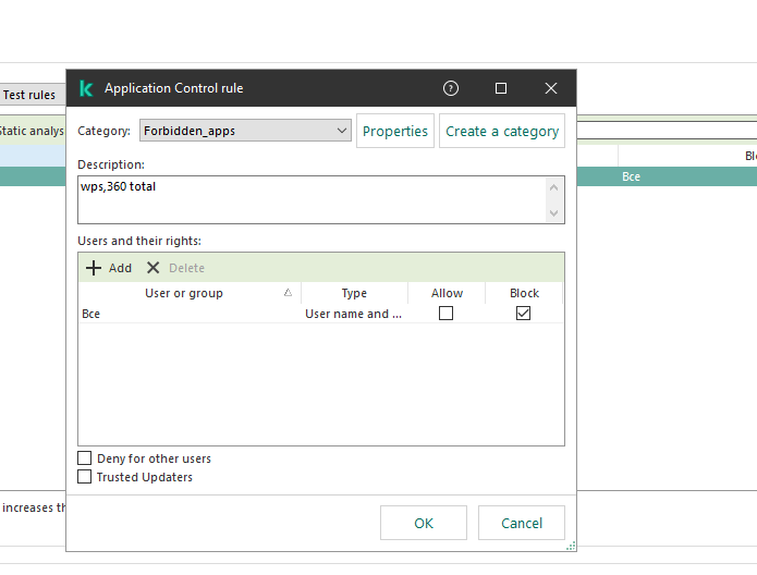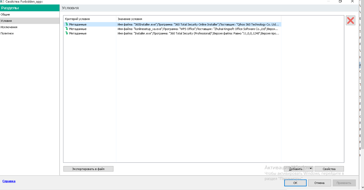 Добрый день, возникла необходимость запрета установки приложений WPS Office и Total 360, включая их браузер. На прикрепленных картинках видно,что я добавил метаданные, используя exe установщиков, в запрещенные приложения, но тем не менее эти приложения продолжают устанавливаться. Подскажите пожалуйста, что я делаю не так? -