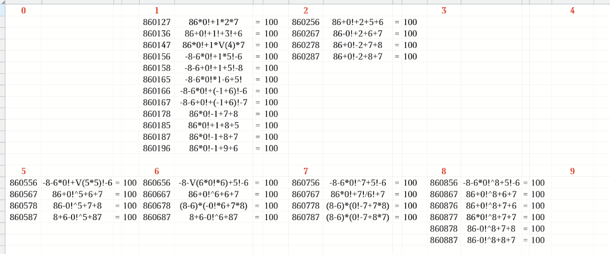 Небольшое дополнение: 8604, 8602 - "не 6" (-(8 + 6) + (0! + 4)!) - 6 = 100 (-8 + (6 - 0!)!) - 2 × 6 = 100 8609 - "не 1" ("не 1, не 2, не 6, не 7, не 10" - нет) (8/6!)^(-0!) + 9 + 1= 100