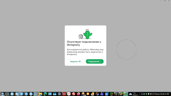 Но чаты уже не загружаются. Мелькает сообщение в WhatsApp - убедитесь, что ваш компьютер подключен к интернету. Через несколько минут опять белый фон в окне WhatsApp -