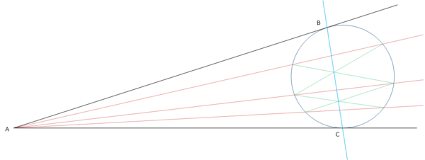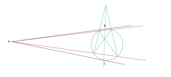 Например, можно решить такую вспомогательную задачу: Рассмотрим на координатной плоскости Oxz точки O(0, 0), N(0, 1), E(1, 0) - т.е. центр окружности и точки, лежащие на окружности единичного радиуса. Для произвольной точки M, лежащей на дуге NE единичной окружности, обозначим через P пересечение отрезка EM с прямой z = 1. Ясно, что двигая точку M по дуге NE, мы можем сделать отношение EM : MP равным произвольному числу. Поэтому преобразованием подобия данную окружность S можно перевести в окружность S1, построенную на отрезке EM как на диаметре в плоскости A', перпендикулярной Oxz, так, чтобы точка A (из задачи про построение линейкой касательной) перешла в точку, лежащую на прямой, проходящей через P перпендикулярно Oxz. Окружность S1 лежит на единичной сфере с центром в начале координат, следовательно, при стереографической проекции она проецируется в окружность S2 на плоскости Oxy. Таким образом, при центральном проектировании плоскости A' на плоскость Oxy из N окружность S1 перейдет в S2, а точка A — в бесконечно удаленную.1 балл