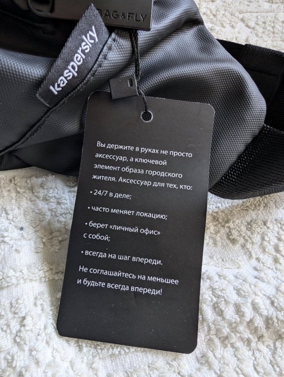 В данной теме представлен обзор с подробным описанием подарочного сувенира, который получен из магазина клуба по бонусной программе, за форумное бета-тестирование, из Магазина «kaspersky<merch» и т. п. Пожалуйста, не обсуждайте в этой теме другие сувениры. . Описание магазина kaspersky<merch поясная сумка, которая сделает ваши тренировки комфортными. Необходимые вещи всегда будут под рукой! Размер: 37х13х8 см. Материал: 100% полиэстер. Материал с защитой от влаги. Одно большее внутреннее отделение, потайной небольшой карман. Регулируемая длина ремня Фото магазина Мои фотографии Имеет два наружных кармана и один потайной. Основной защищен от попадания воды. Нижний не глубокий, примерно 5 сантиметров. На замках молнии нанесена торговая марка BAG&FLY. В основном кармане лежал какой то матерчатый мешочек, размером 21х42 см.1 балл