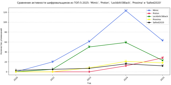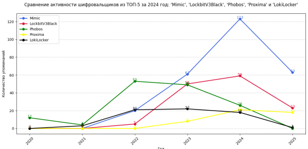 Сравнение активности шифровальщиков из ТОП-5-2024: Сравнение активности шифровальщиков из ТОП-5-2025 (на текущее состояние базы): На графиках сравнения активности видим, что наиболее активные шифровальщики из ТОП-5 за 2020, 2021, 2022: Crysis, CrylockV2.0, Wannacash,Thanos, Phobos, Sojusz на текущий момент практически угасли.2 балла