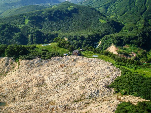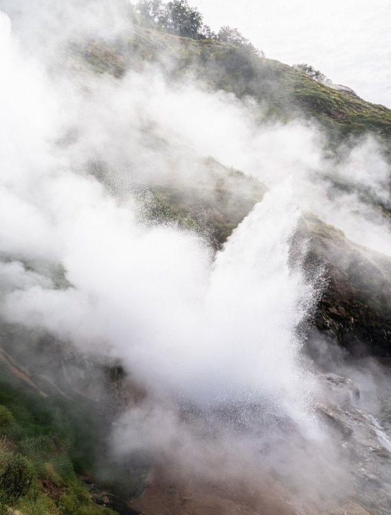 6. А вот примерно те же картинки в начале августа 2008 года. Вот как оно могло так остановиться прямо перед жилыми постойками! И озеро стало сильно более симпатичного цвета: Но многие гейзеры действительно оказались залиты водой и засыпаны горной породой. Например, гейзер Большой: Прошло время, вода пропилила дамбу, озеро исчезло - и гейзеры начали потихоньку восстанавливаться. Например, гейзер Большой (который залит водой на предыдущей фотке) вполне себе уверенно себя чувствует и извергается регулярно примерно раз в час. И под его работу подстраивают график прогулок туристов вертолётных экскурсий И как мне на уши нажужжали, именно это является главной причиной почему не восстанавливают мостик на другую сторону долины и туда не водят экскурсии - прогулка просто затянется, гидов-экскурсоводов просто не хватит для обслуживания всего туристического потока... Посему, примерно вот так как есть и есть.