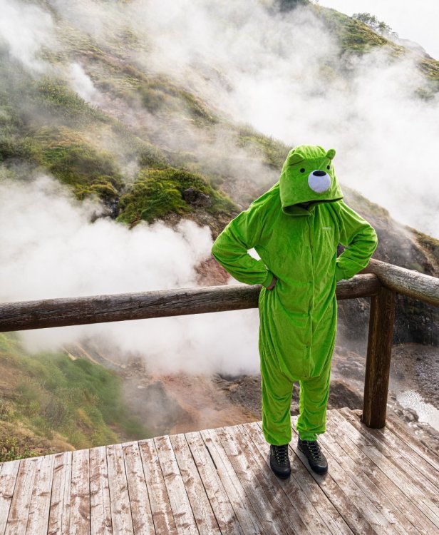 2. Ну и обычная стандартная прогулка по туристическому маршруту ДГ у нас, конечно, тоже была. А как же без этого! Уже много раз рассказывал, показывал - так что буду краток. Гейзеры = работают. Не все регулярно - например, гейзер Великан всё никак не может выйти на проектную мощность, но большинство же активных гейзеров совершенно не халтурят: Зелёный-медвед Мидори-Кума в восторге: Витраж пыхтит с обычной активностью: Грязевые котлы к осени немного подсыхают - это нормальный сезонный цикл: "Глаза ада" (или как их там) тоже на месте и продолжают смотреть на нас всех: Прочие природные уникальности здесь как всегда в ассортименте: Что интересно, краски здесь совершенно не осенние! Не как в соседнем Узоне. Почему так? - непонятно. Может быть, здесь в долине просто теплее, и осень наступает чуть позже? Наверное, всё на этом про ДГ, пора двигать дальше!