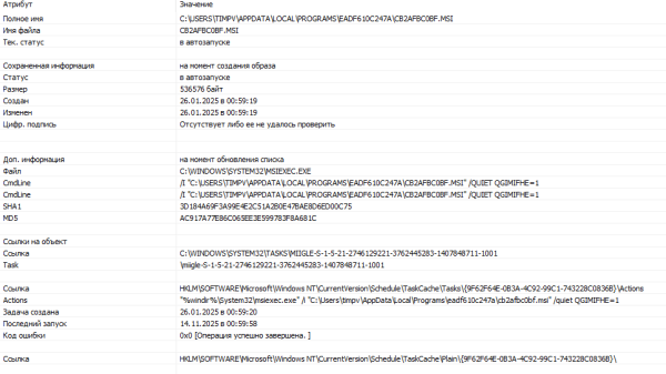 (!) Не удалось открыть ключ: [Error: 0x5 - Отказано в доступе. ] HKLM\SYSTEM\ControlSet001\Services\4fcb0f21e + ПОДОЗРИТ(А)| FAKE:C:\WINDOWS\SYSTEM32\DIALER.EXE [15764] ПОДОЗРИТ(А)| FAKE:C:\WINDOWS\SYSTEM32\DIALER.EXE [16296] ПОДОЗРИТ(А)| FAKE:C:\WINDOWS\SYSTEM32\DIALER.EXE [16628] ПОДОЗРИТ(А)| FAKE:C:\WINDOWS\SYSTEM32\DIALER.EXE [18748] + Множественные потоки в системных файлах: (!) ПРЕДУПРЕЖДЕНИЕ: Обнаружен внедренный поток в процессе C:\WINDOWS\SYSTEM32\SVCHOST.EXE [3600], tid=11224 -------------- Возможно, что цепочка запускается через эту задачу: Сделайте новый образ автозапуска с отслеживанием процессов и задач. Если антивирус будет блокировать запуск, или получение файла образа - временно отключите защиту антивируса. 1. Скачайте архив с актуальной версией утилиты uVS c зеркала программы отсюда (1) или отсюда(2) (здесь дополнительно встроен архиватор 7zip), распакуйте данный архив с программой в отдельный каталог. 2. запустите из каталога с модулями uVS файл Start.exe (для Vista, W7- W11 выберите запуск от имени Администратора) 3. В стартовом окне программы - нажать "запустить под текущим пользователем". (если текущий пользователь с правами локального администратора) 3.1 Если запросили обычный образ автозапуска, переходим сразу к п.4 Если запросили образ автозапуска с отслеживанием процессов и задач: В главном меню выбираем "Дополнительно" - Твики" - нажимаем "твик 39" и перегружаем систему. После перезагрузки переходим к п.2 и выполняем все действия из 2, 3, 4, 5, 6. 4. Далее, меню "Файл" / Сохранить Полный образ автозапуска. 5. Дождитесь, пока процесс создания файла образа завершится. Сохраненный файл образа автозапуска (с именем Ваш_компьютер_дата_время*.txt) автоматически добавится в архив 7z. (если используется uVS из зеркала со встроенным архиватором 7z) --------------------------1 балл