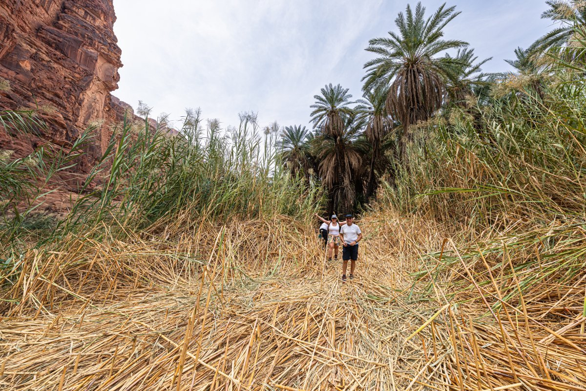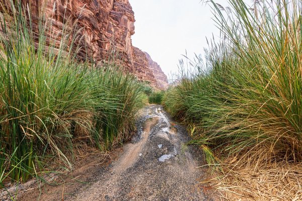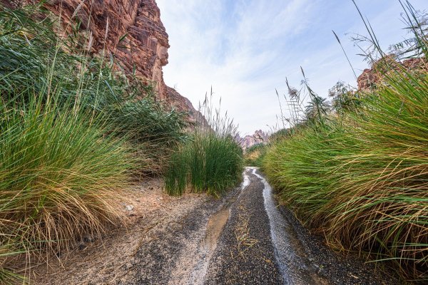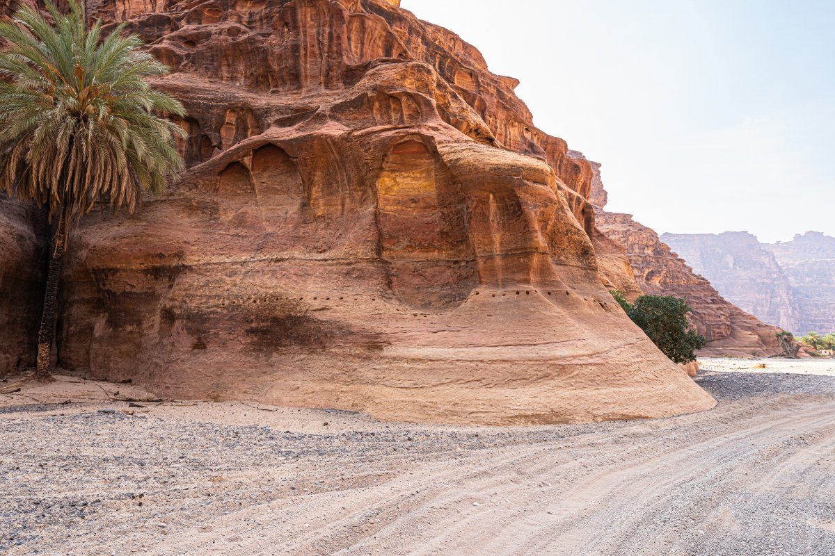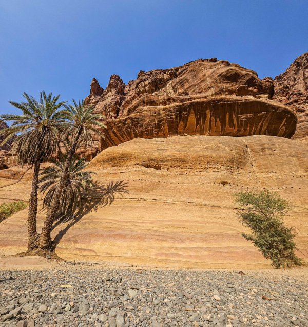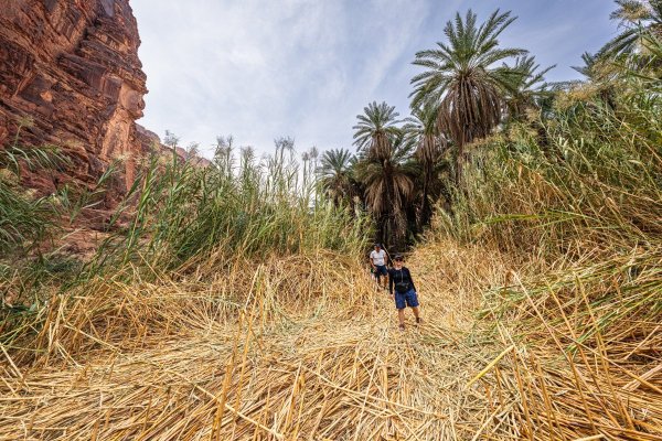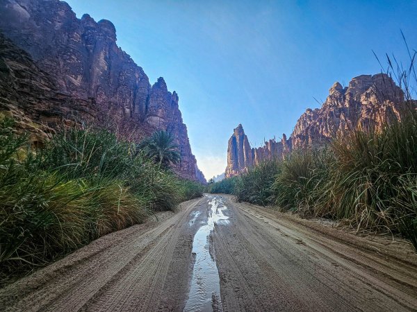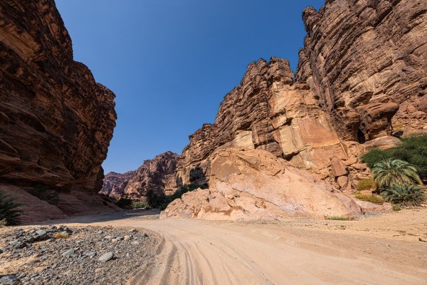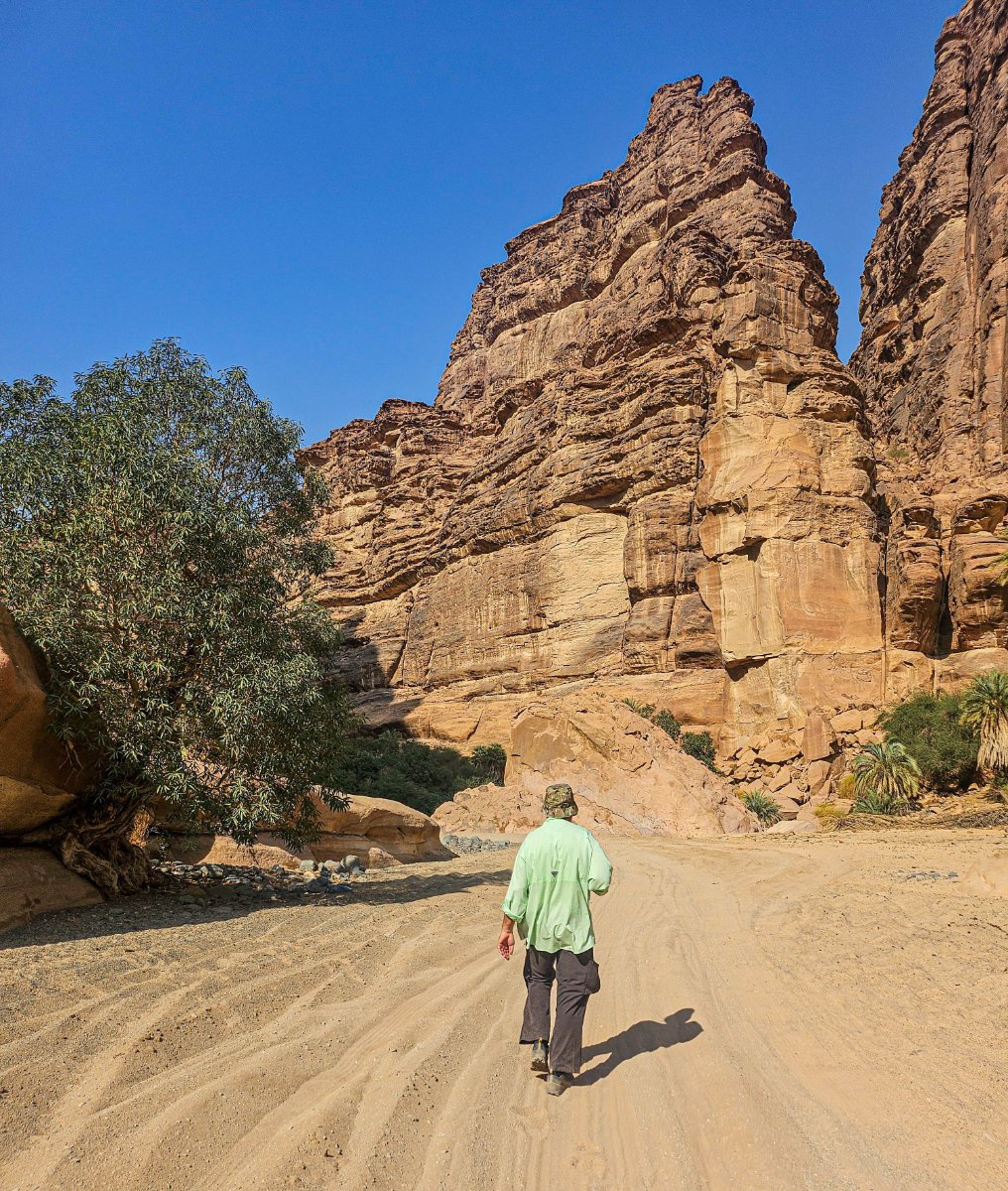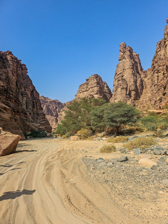 Просто роскошные виды! Одна проблема - идти по такому песку не вполне комфортно, закапываешься. Примерно как по рыхлому снегу - Вторая проблема, с которой можно столкнуться - это местный климат. Он здест резко континентальный с большими перепадами температур. Плюс летом жара, зимой холод - крайние значения от -7°С (минус!) до +44°С – смотреть сюда. То есть, для прогулок комфортная погода здесь только ноябрь - начало декабря и март - начало апреля. Ну а дальше - просо фотки. Много фоток! - и лишние комментарии здесь совершенно не к месту -> И такая красота - целых 10+ километров! Но их нужно пройти... поскольку мы - турист созерцательный. А созерцать такие красоты надо неспеша. Боковое ущелье - любопытно... Но оно быстро закончилось тупиком. И следами запрещённого здесь барбекю Идём дальше - Обратите внимание - нижняя часть скалы на несколько метров от земли как будто отполирована, а дальше идёт шероховатый камень. Но это же означает, что здесь случаются потоки воды вот такой глубины и силы! Ого-го себе.. Когда? Сезон дождей здесь вроде бы декабрь-январь... Загадочные дырки примерно на одном уровне - говорят, что это были какие-то исследования компании Сауди Арамко - но причём здесь нефть? Это же нефтяная компания! Непонятно и загадочно.. Ещё одна боковая долина открылась - любопытно, но, увы, некогда.. И дрон не запустишь - они в КСА тотально запрещены. Ну, значит, просто идём дальше и красотами любуемся: Что интересно - мы практически в полном одиночестве! (только наши две машины где-то сзади за нами на всякий случай ползут). Изредка проезжают местные жители, иногда повозка с туристами - и всё. Больше никого, несмотря на выходной день (пятница здесь - выходной). Можно забраться на какую-нибудь скалу - красотища! Каменные скальные фигуры - просто инопланетяне какие-то... Внезапно - тростник! Как это?.. Да очень просто. Примерно в середине пешего маршрута из песка начинает пробиваться вода - и дальше дорога становится мокрой, идёт вдоль ручья. Иногда - вот в таких зарослях: Прямо или налево? Если прямо, то будут проблемы расходиться со встречными машинами (если вдруг появятся) - Резонный вопрос - а видели мы других пеших туристов? - Нет. Никого более гулявших пешком мы здесь не встретили. Все остальные передвигались только на авто..3 балла