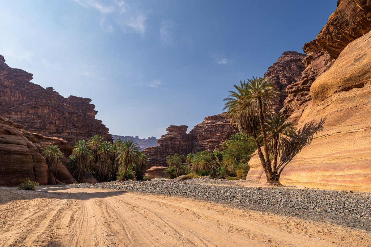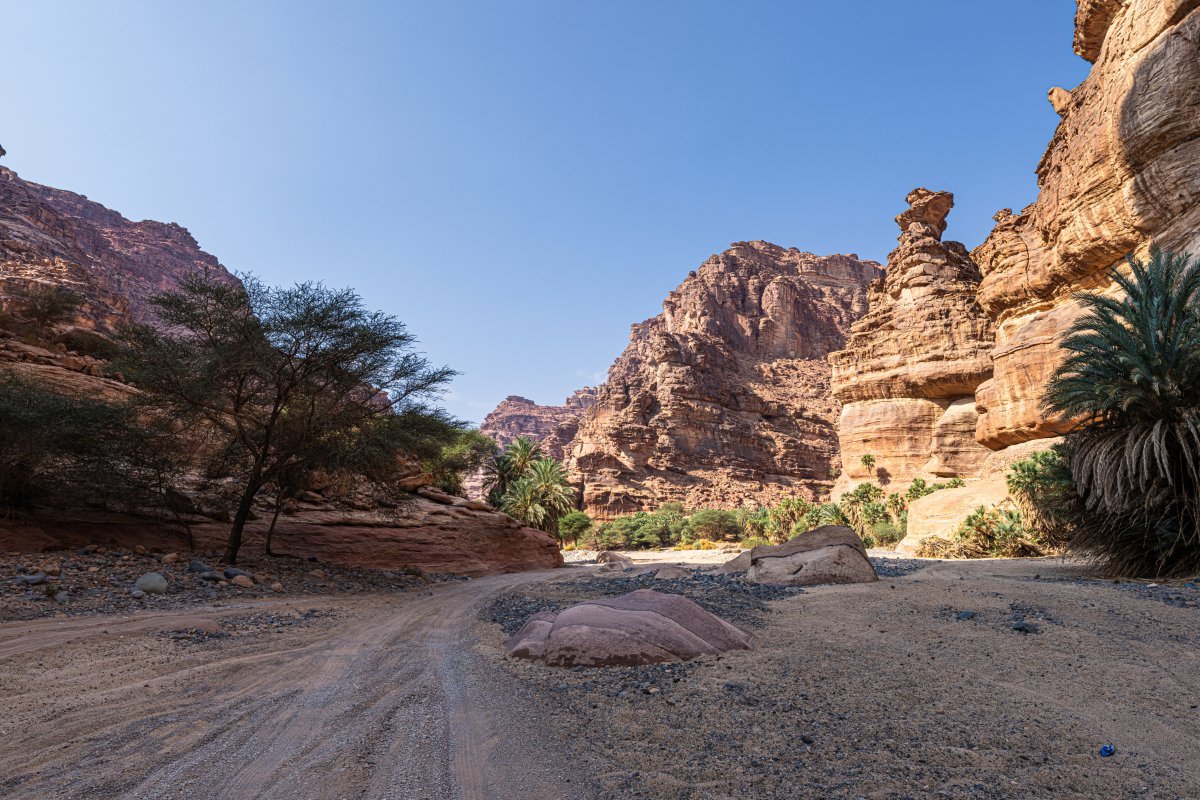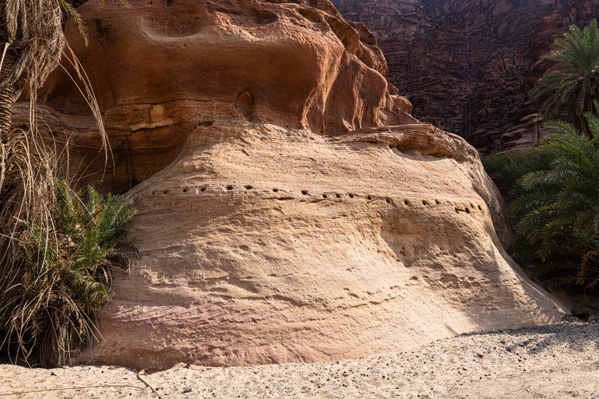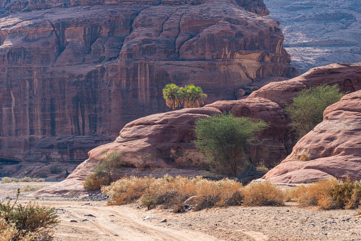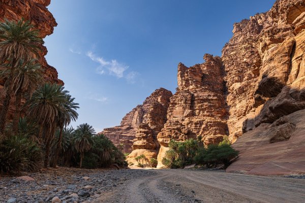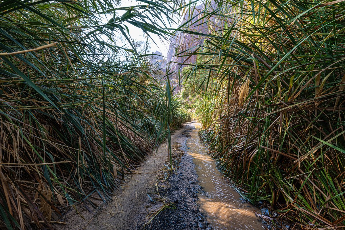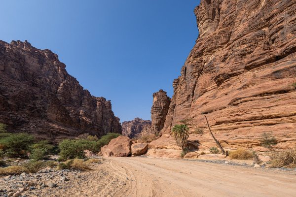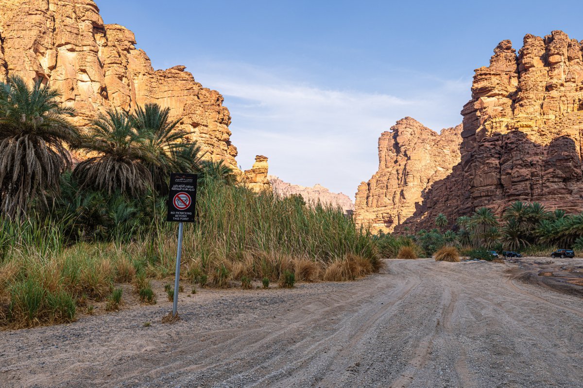 Просто роскошные виды! Одна проблема - идти по такому песку не вполне комфортно, закапываешься. Примерно как по рыхлому снегу - Вторая проблема, с которой можно столкнуться - это местный климат. Он здест резко континентальный с большими перепадами температур. Плюс летом жара, зимой холод - крайние значения от -7°С (минус!) до +44°С – смотреть сюда. То есть, для прогулок комфортная погода здесь только ноябрь - начало декабря и март - начало апреля. Ну а дальше - просо фотки. Много фоток! - и лишние комментарии здесь совершенно не к месту -> И такая красота - целых 10+ километров! Но их нужно пройти... поскольку мы - турист созерцательный. А созерцать такие красоты надо неспеша. Боковое ущелье - любопытно... Но оно быстро закончилось тупиком. И следами запрещённого здесь барбекю Идём дальше - Обратите внимание - нижняя часть скалы на несколько метров от земли как будто отполирована, а дальше идёт шероховатый камень. Но это же означает, что здесь случаются потоки воды вот такой глубины и силы! Ого-го себе.. Когда? Сезон дождей здесь вроде бы декабрь-январь... Загадочные дырки примерно на одном уровне - говорят, что это были какие-то исследования компании Сауди Арамко - но причём здесь нефть? Это же нефтяная компания! Непонятно и загадочно.. Ещё одна боковая долина открылась - любопытно, но, увы, некогда.. И дрон не запустишь - они в КСА тотально запрещены. Ну, значит, просто идём дальше и красотами любуемся: Что интересно - мы практически в полном одиночестве! (только наши две машины где-то сзади за нами на всякий случай ползут). Изредка проезжают местные жители, иногда повозка с туристами - и всё. Больше никого, несмотря на выходной день (пятница здесь - выходной). Можно забраться на какую-нибудь скалу - красотища! Каменные скальные фигуры - просто инопланетяне какие-то... Внезапно - тростник! Как это?.. Да очень просто. Примерно в середине пешего маршрута из песка начинает пробиваться вода - и дальше дорога становится мокрой, идёт вдоль ручья. Иногда - вот в таких зарослях: Прямо или налево? Если прямо, то будут проблемы расходиться со встречными машинами (если вдруг появятся) - Резонный вопрос - а видели мы других пеших туристов? - Нет. Никого более гулявших пешком мы здесь не встретили. Все остальные передвигались только на авто..3 балла