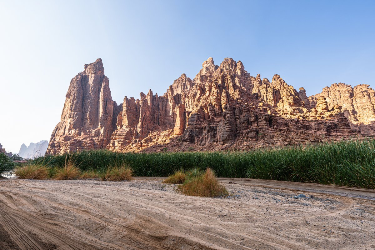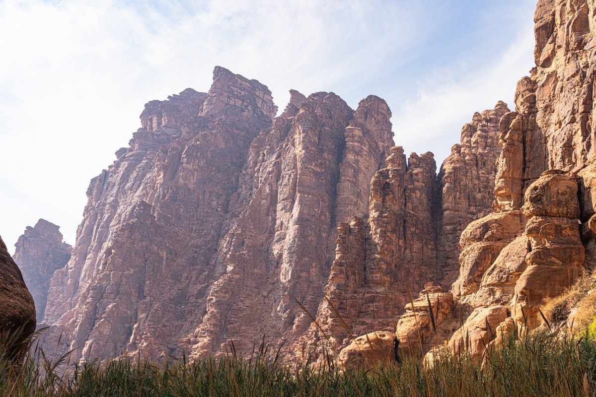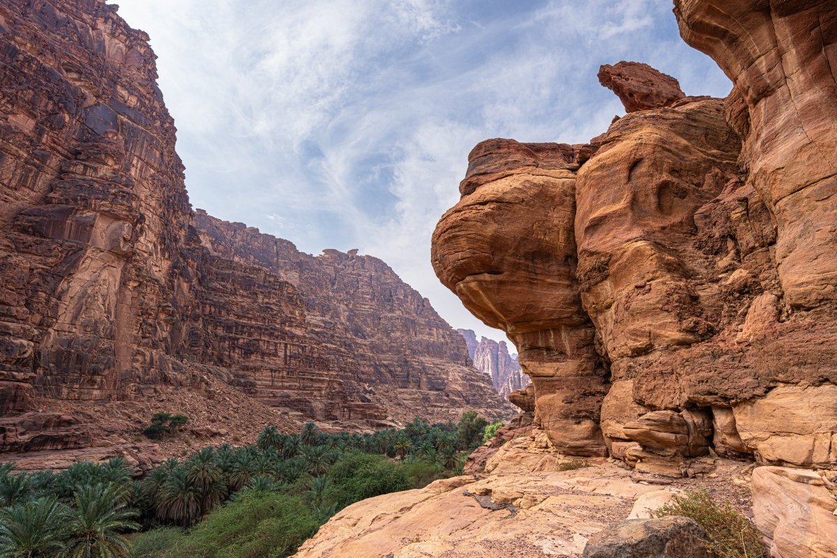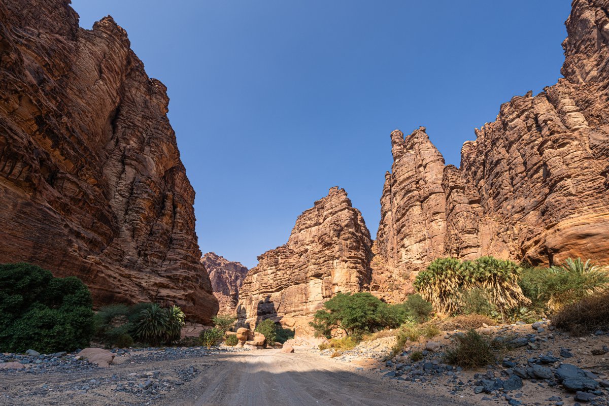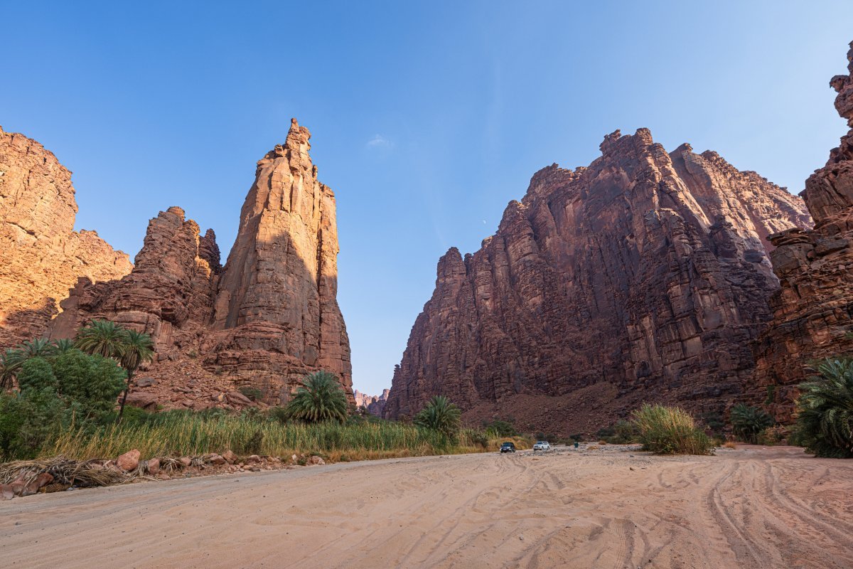 Просто роскошные виды! Одна проблема - идти по такому песку не вполне комфортно, закапываешься. Примерно как по рыхлому снегу - Вторая проблема, с которой можно столкнуться - это местный климат. Он здест резко континентальный с большими перепадами температур. Плюс летом жара, зимой холод - крайние значения от -7°С (минус!) до +44°С – смотреть сюда. То есть, для прогулок комфортная погода здесь только ноябрь - начало декабря и март - начало апреля. Ну а дальше - просо фотки. Много фоток! - и лишние комментарии здесь совершенно не к месту -> И такая красота - целых 10+ километров! Но их нужно пройти... поскольку мы - турист созерцательный. А созерцать такие красоты надо неспеша. Боковое ущелье - любопытно... Но оно быстро закончилось тупиком. И следами запрещённого здесь барбекю Идём дальше - Обратите внимание - нижняя часть скалы на несколько метров от земли как будто отполирована, а дальше идёт шероховатый камень. Но это же означает, что здесь случаются потоки воды вот такой глубины и силы! Ого-го себе.. Когда? Сезон дождей здесь вроде бы декабрь-январь... Загадочные дырки примерно на одном уровне - говорят, что это были какие-то исследования компании Сауди Арамко - но причём здесь нефть? Это же нефтяная компания! Непонятно и загадочно.. Ещё одна боковая долина открылась - любопытно, но, увы, некогда.. И дрон не запустишь - они в КСА тотально запрещены. Ну, значит, просто идём дальше и красотами любуемся: Что интересно - мы практически в полном одиночестве! (только наши две машины где-то сзади за нами на всякий случай ползут). Изредка проезжают местные жители, иногда повозка с туристами - и всё. Больше никого, несмотря на выходной день (пятница здесь - выходной). Можно забраться на какую-нибудь скалу - красотища! Каменные скальные фигуры - просто инопланетяне какие-то... Внезапно - тростник! Как это?.. Да очень просто. Примерно в середине пешего маршрута из песка начинает пробиваться вода - и дальше дорога становится мокрой, идёт вдоль ручья. Иногда - вот в таких зарослях: Прямо или налево? Если прямо, то будут проблемы расходиться со встречными машинами (если вдруг появятся) - Резонный вопрос - а видели мы других пеших туристов? - Нет. Никого более гулявших пешком мы здесь не встретили. Все остальные передвигались только на авто..3 балла