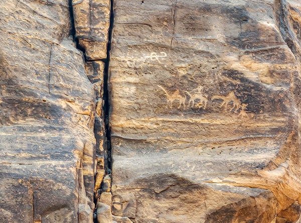 На эти каменные конструкции можно смотреть бесконечно - они все разные! Но почему-то не обнаружено ни одной арки - хотя в соседней Вади-Рам их довольно много.. Ну, хоть дырка в скале есть - будем считать, что тема каменных арок раскрыта И опять вперёд по саудовским джунглям: Ещё раз обращаю внимание - каменные стенки отполированы - и, очевидно, водными потоками. Это же какие наводнения здесь иногда происходят! И прочие разные картинки: А на этой стенке - петроглифы. Какие-то надписи, верблюды выцарапаны.. Сколько лет этим картинкам - неведомо... Ой, а эта надпись на греческом что-ли? Рядом с картинкой вроде как черепахи -4 балла