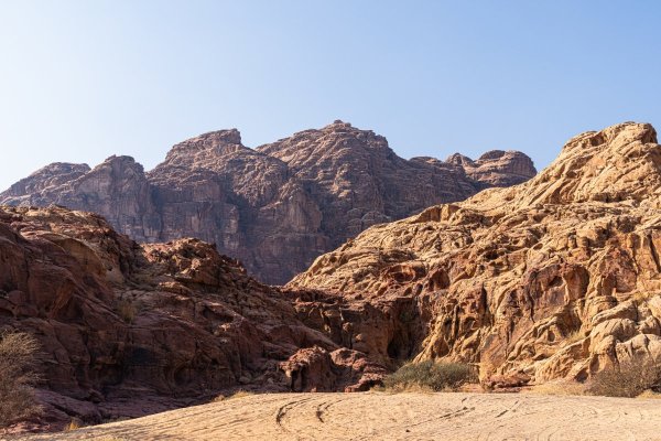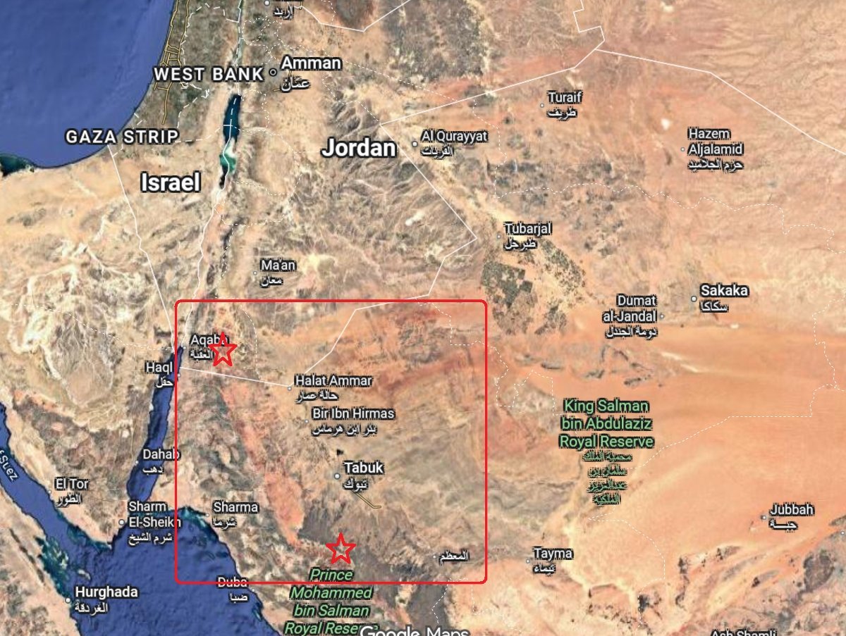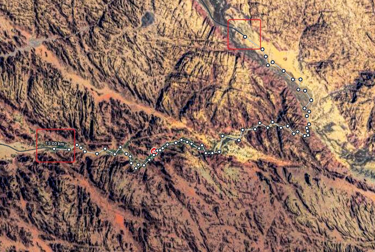 Теперь же где это всё находится - а вон там, на северо-западе Королевства Саудовская Аравия (КСА), почти на границе с Иорданией и недалеко от Красного моря, на карте вот тут (красным также выделен Эр-Рияд, столица КСА) -> С другой стороны от границы находится пустыня Вади-Рам, про которую рассказывал в ноябре 2022-го. Поскольку оба объекта находятся в одной и той же географии, то картинки Вади-Дисах немного напоминают "соседские" ландшафты.. Как добираться до этих красот? - сначала долететь до города Табук (регулярных рейсов довольно много), переночевать там (вполне приличные отели тоже есть), а потом целый день потратить на местные красоты. Мы доехали до северо-восточной части долины - Прошли весь маршрут насквозь и вернулись другой дорогой, примерно вот так: Туда с остановками на фотосессии (а там есть что пофоткать) ехали два часа, обратно - три, а гуляли по местным красотам (с часовым перевыром на обед) аж шесть часов. Ну сложно там идти быстрее, если по сторонам разные красоты показывают! Даже сверху на спутниковых снимках всё достаточно многообещающе смотрится: А топать всего придётся (если решитесь) - аж 15км. Не слишком много, но и немало.3 балла