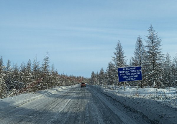 Традиционная остановка у знака "1111" -> И снова бесконечные, завораживающие, гипнотические пространства дорог - да, она такая, эта трасса Р-504 "Колыма".. Поворот на дорогу "44Н-4", альтернативный маршрут к Магадану - идёт в стороне от главной трассы "Колыма". Эта дорога постожнее (перевалы и серпантины - аж шесть или семь перевалов с серпантинами), но зато она гораздо более созерцательная! Особенно глазами водителя.. К тому же здесь аномально тепло (см. погоду в Магадане) и лёд на дорогах южных перевалов стал дерзко скользким.. Но зато - как там красиво! Зимняя сказка.. Местные топонимы доставляют особого удовольствия = перевал Гаврюшка Но тема топонимов - это отдельно. Там много, насыщенно, необычно.2 балла