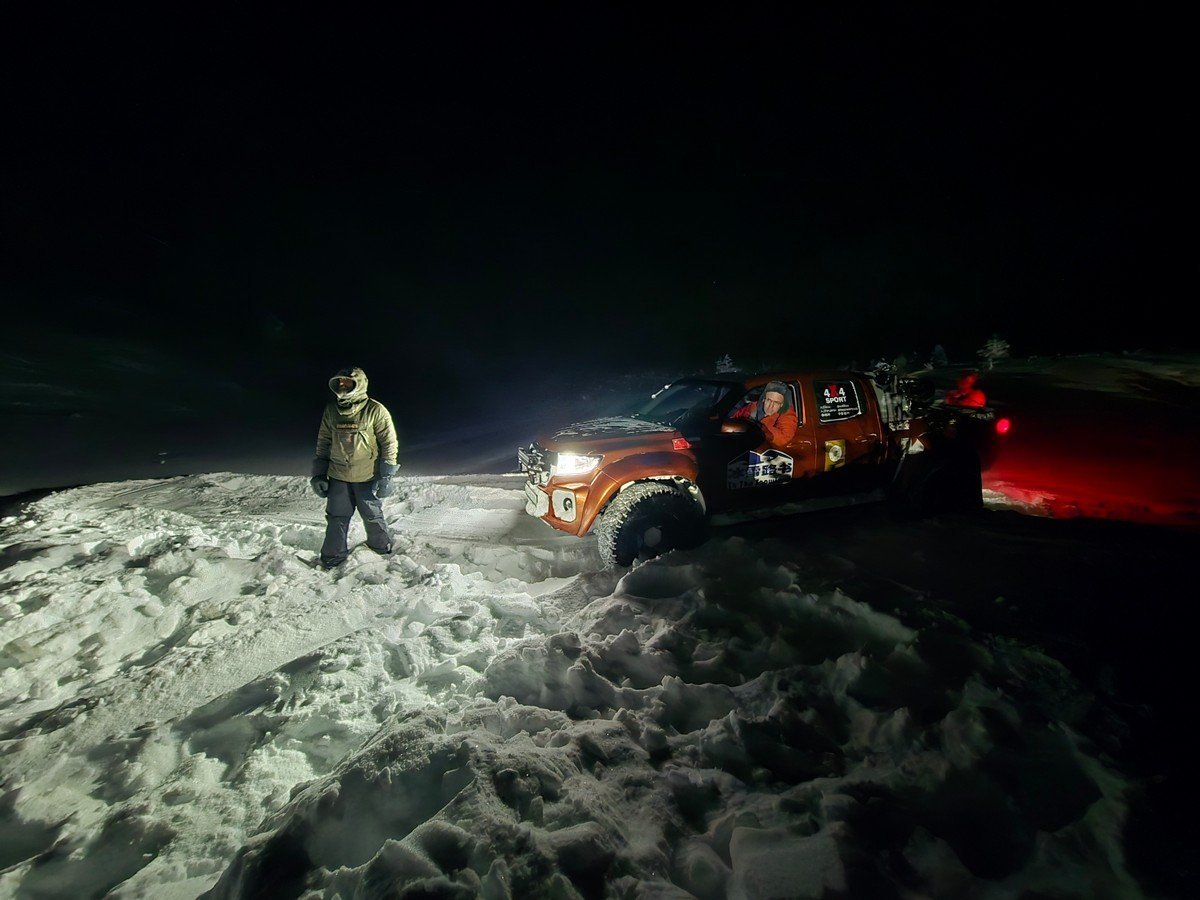 Проезд по Старому колымскому тракту начался сложно. И это вовсе не из-за похолодания до -44 (ниже наш летний забортный градусник не показывал, а бортовые градусники отключились уже на -39). У моста через Индигирку в 2024 г. провалился пролёт (нам удалось его застать и воспользоваться во время экспедиции в Тикси ), а объезды по льду с обеих сторон от моста упёрлись в воду. Поэтому мы включили "план Б" и совершили ~30-километровый крюк через село Орто-Балаган, чтобы пересечь Индигирку по наледи. При попытке форсирования реки справа от моста наш автомобиль зацепился за препятствие, оторвал часть порога и перекосил дверь. Ранее на месте скола треснуло лобовое стекло. Намёк понятен, но на дорожные качества это не влияет. Едем дальше! Штатный термометр ожил примерно в 9:30. Рубились через Индигирку из Орто-Балагана больше часа. Помог записанный нами в 2024 г. трек. Ведь в этих местах мы уже были 2 года назад и проехали СКТ до заброшенного села Куранах-сала. Вышли на дорогу в 11.15. Километров за 20 до перевала начался Снег. Очень МНОГО СНЕГА. Хозяин гостевого дома в Томторе предупреждал, что в этом году в районе аномально много снега. Мы включили пониженные передачи и блокировки. Мне посчастливилось "штурманить" у начальника колонны: незабываемые впечатления. Как будто смдишь на лодке, которая намотала на винт водоросли и пытается с ними всё таки плыть вперёд. Чем дальше в горы, тем выше снег. Сначала ниже колена, потом выше колена, а вот сейчас уже приближается к "по пояс". Пришлось регулярно включать VPN выпускать лопатно-толкательные команды, чтобы машины продолжали идти вперёд. Так наше путешествие превратилось в приключение. На вопрос "как ты отпраздновал 23 февраля?" Я могу честно ответить: гондурасил, "строил "Колыму". За 5,5 часов проехали всего 6 км. Машины вязли в снегу, как в песке. Ведущая машина с трудом торила путь, остальные постоянно приходиллсь откапывать и толкать. "Толкать-копать!" - шутили мы. Давление в шинах спустили до 0,6 - 0,8 атмосфер. У ведущего было... 0,2. До перевала (3й индигирский перевал) мы так и не добрались. Километров за 10 ведущий спустился раскатывать дорогу к ручью и... вызвал помощь "лопатдорстроя", отметив, что снег стал непроходимым и дня него. Поэтому возвращаемся назад в Томтор, встречаем рассвет и... на завтрак в "Кубу" А что у нас в меню? Дальше по пути в Усть-Неру нас ждал один из самых живописных участков трассы "Колыма" - Ольчанский перевал. Сколько раз здесь был, не перестаю удивляться.2 балла