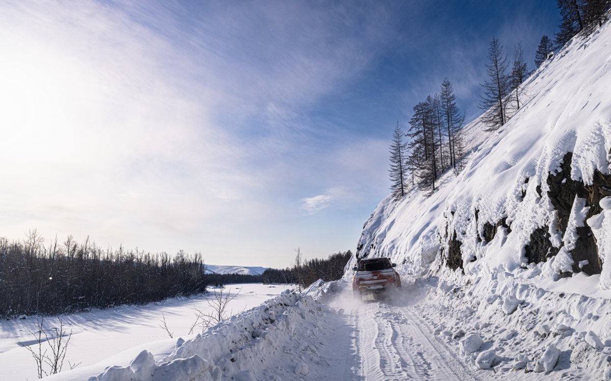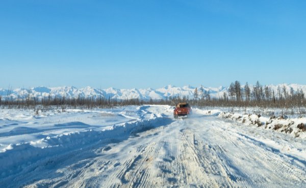 Рывок в сторону - зачем? Сейчас узнаете: Но эта затея чуть тоже не была испорчена "наледями" - вот такими: Красивенько! Но как это проехать? Ура! У нас есть опытный руководитель, который нашёл проход - и мы его прошли! А цель была - полетать дронами и пофоткать сверху пару якутских вулканов. Да, есть такие! Вот один из них на горизонте маячит: Да и просто - очень красивый автозимник! Кстати, он отсутствует на яндокартах... Да и в разные стороны здесь покататься - ай, как хорошо!2 балла